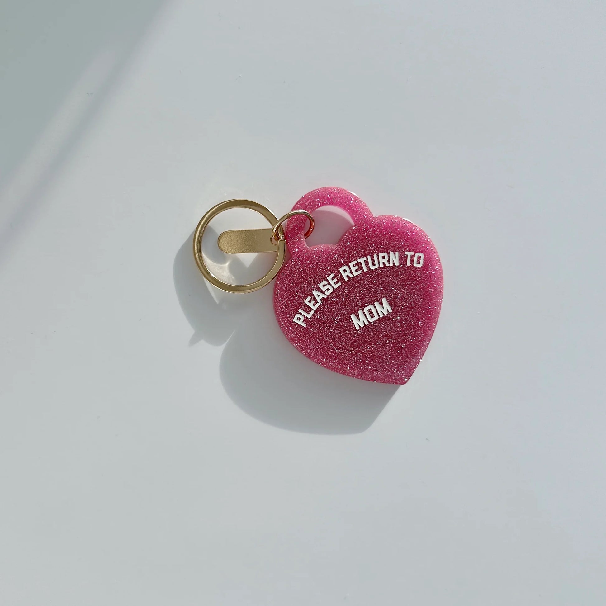 Please Return to Mom Schlüsselanhänger weiß graviert.