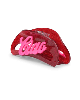 Glitzer Klammer mit Ciao und Bella Schriftzug aus Acetat.