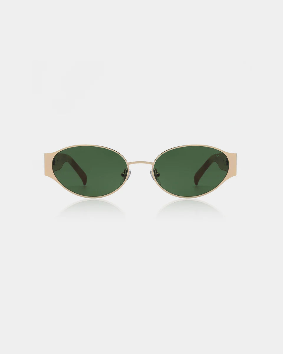 Bella ist eine kompakte Sonnenbrille im ovalen 90er-Jahre-Stil mit einer leichten Cat-Eye-Note und goldenen Akzenten.