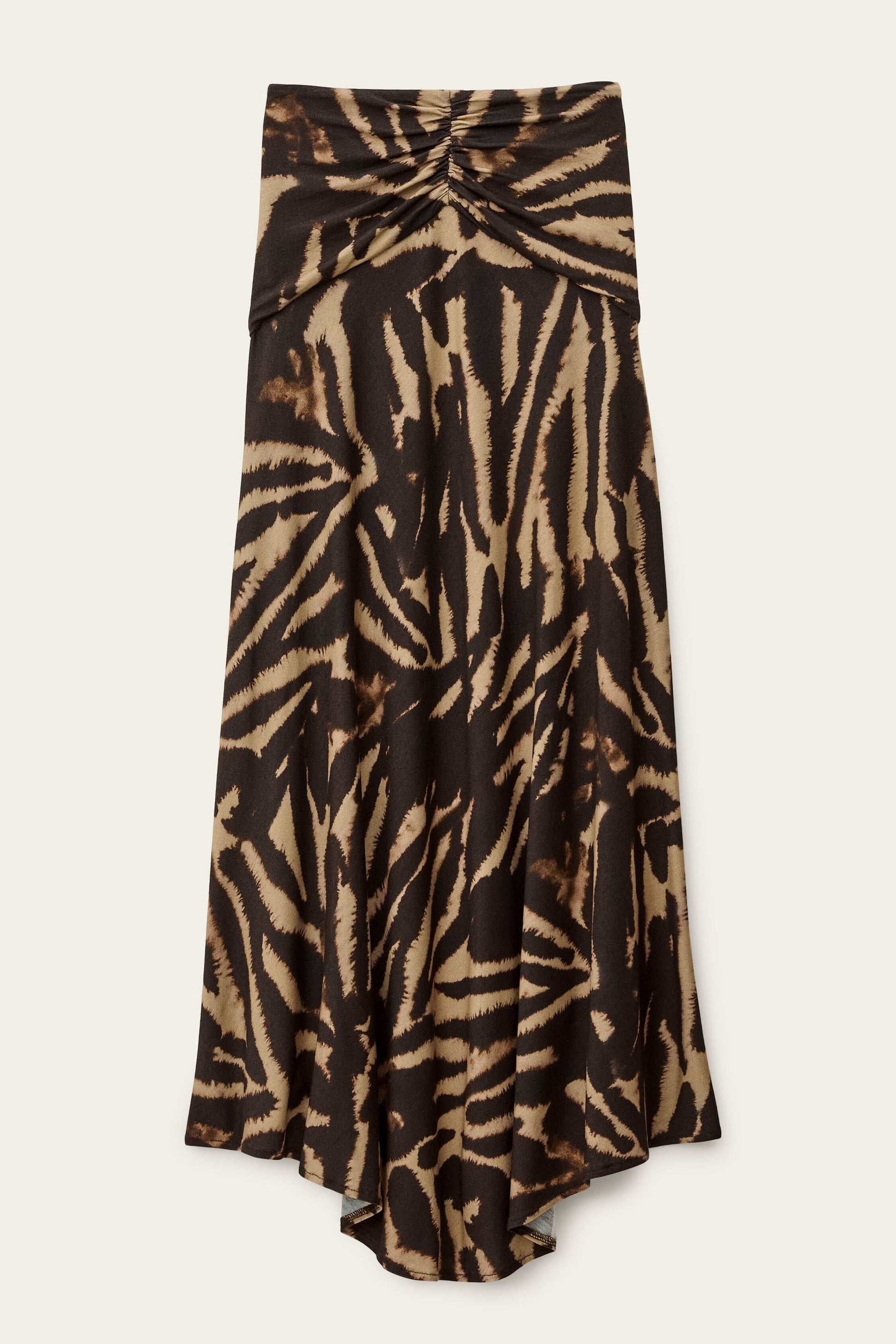 Brauner Midirock mit asymmetrischem Schnitt, Zebra-Print und Raffungen am Bund.