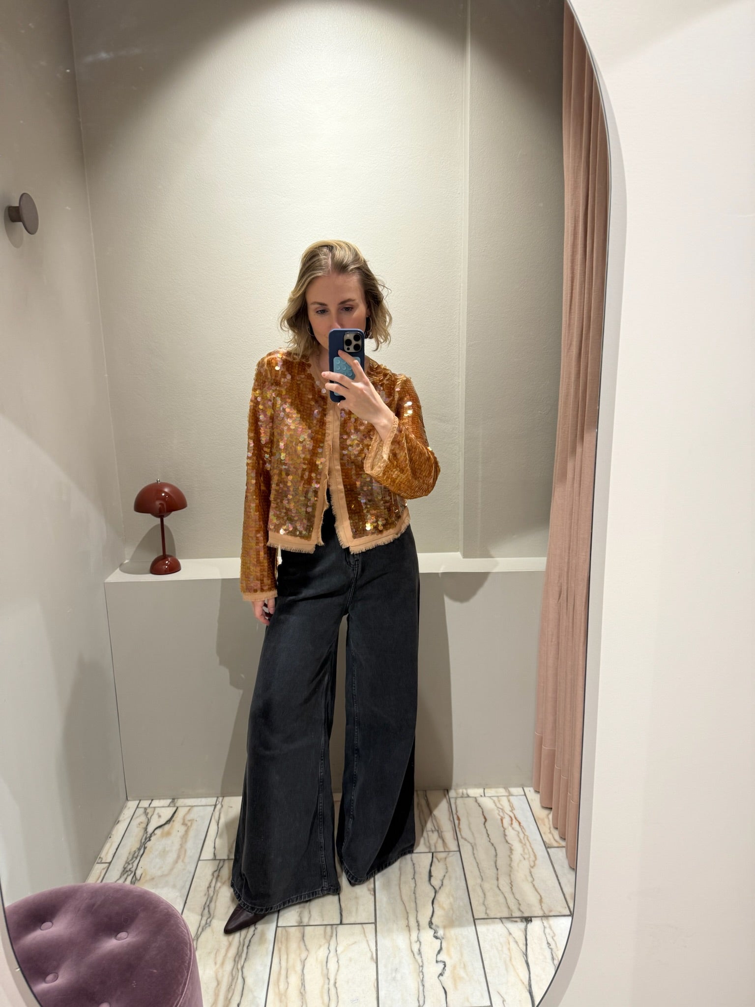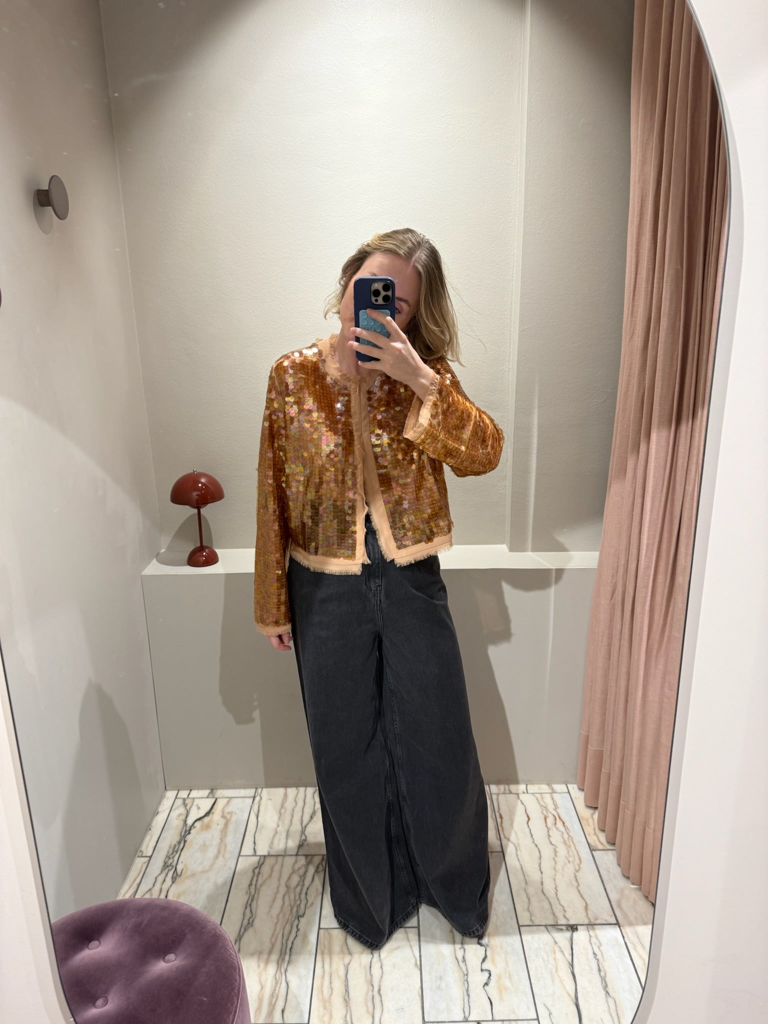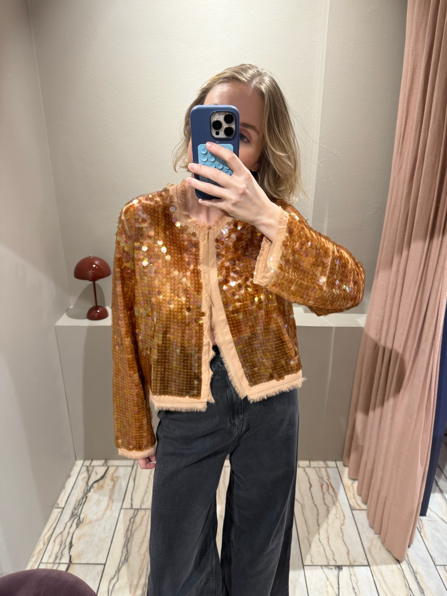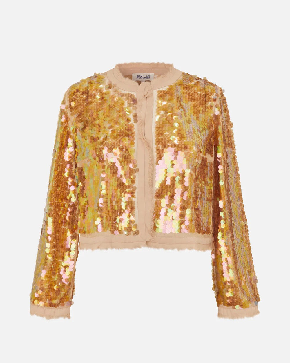 Leicht transparente, kurze Paillettenjacke mit ausgefransten Kanten. Die Jacke hat eine eher entspannte Passform und einen Einzelhakenverschluss am Hals.