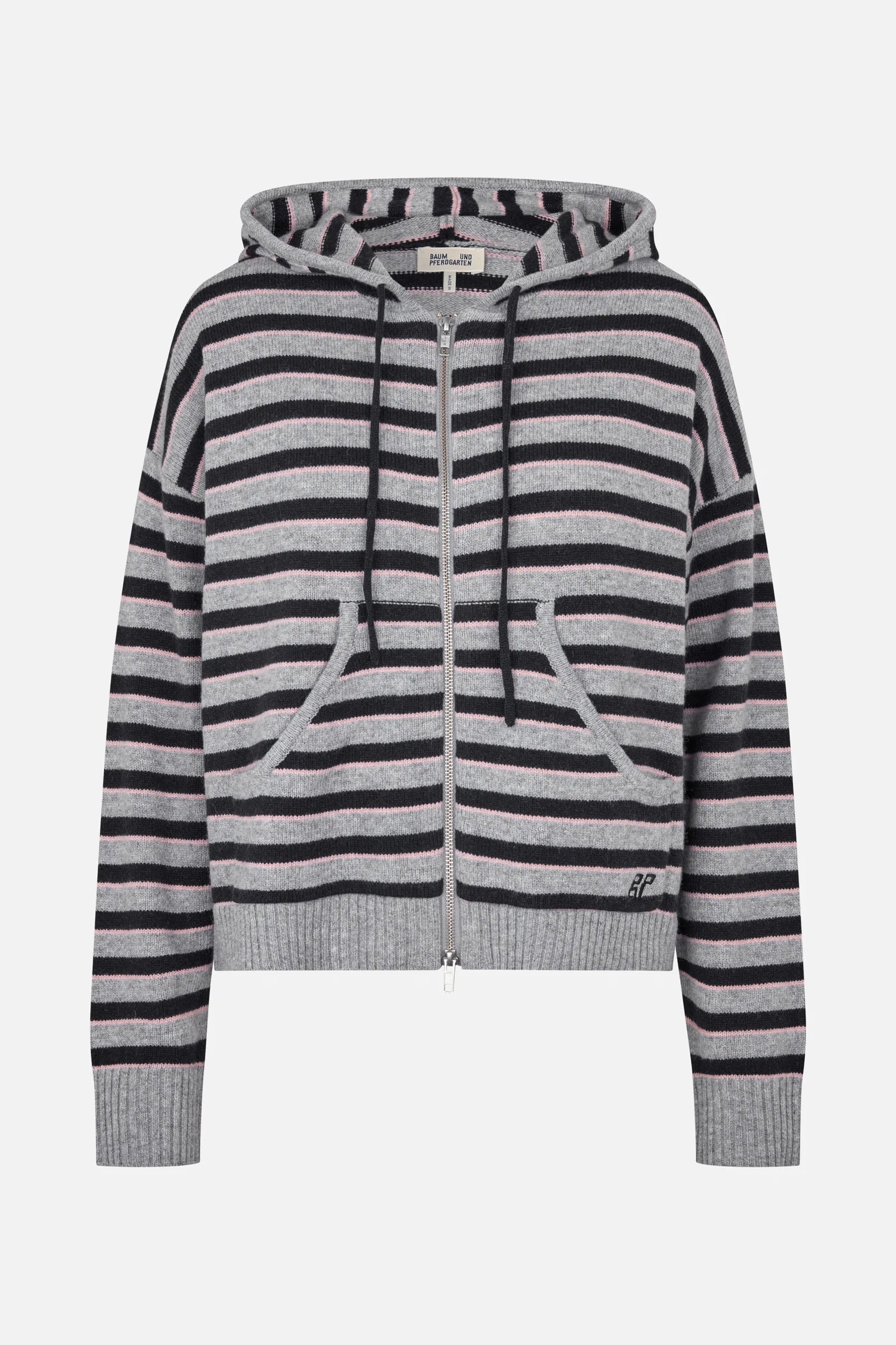 Der gestreifte Kapuzenpulli hat eine lockere Passform mit überschnittenen Schultern, Seitentaschen und einer Kapuze mit Kordelzug, wodurch er sich perfekt fürs Layering eignet.