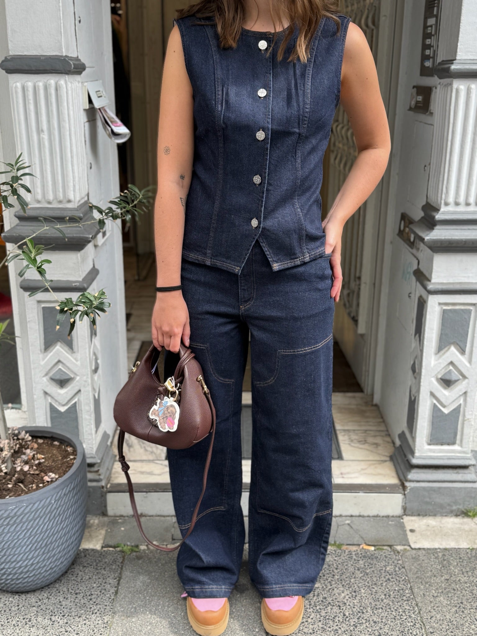 Das Top Mene ist ein echter Denim-Klassiker aus Bio-Baumwolle. Die maßgeschneiderte Denim-Weste hat eine taillierte Silhouette mit Rundhalsausschnitt und klassischem Knopfverschluss für ein raffiniertes und zeitloses Design. Kombinieren Sie sie mit einem unserer Röcke für einen coolen Alltagslook – oder tragen Sie sie mit passender Jeans für den kompletten Denim-Look.