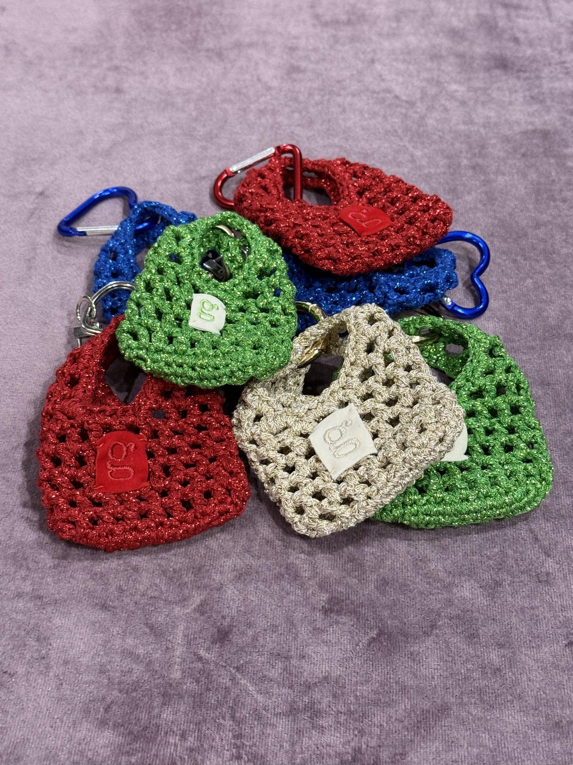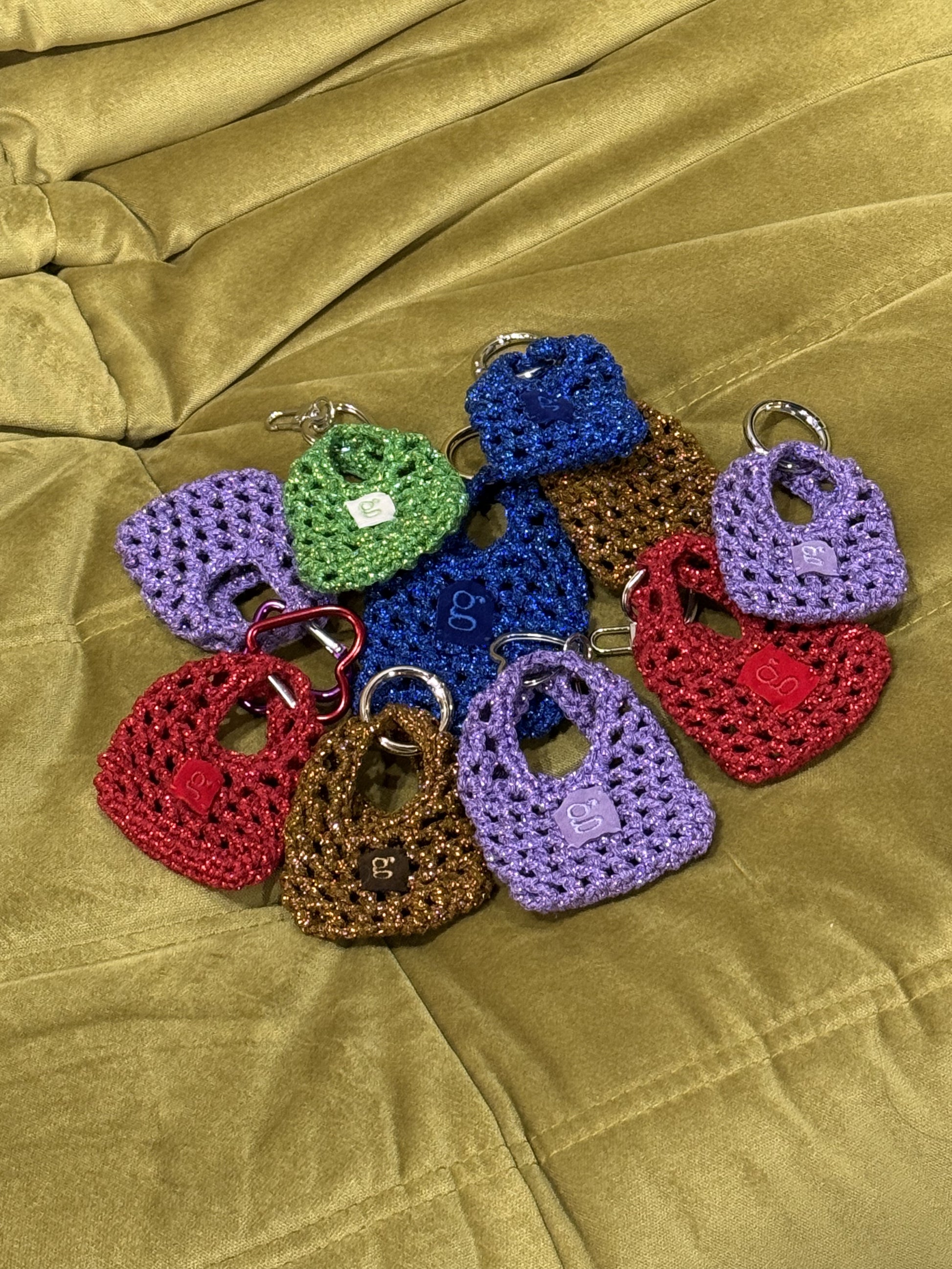 Unsere G-bag für an die Bag. Alle Bag Charms sind unikate und variieren in Größe und Karabiner.