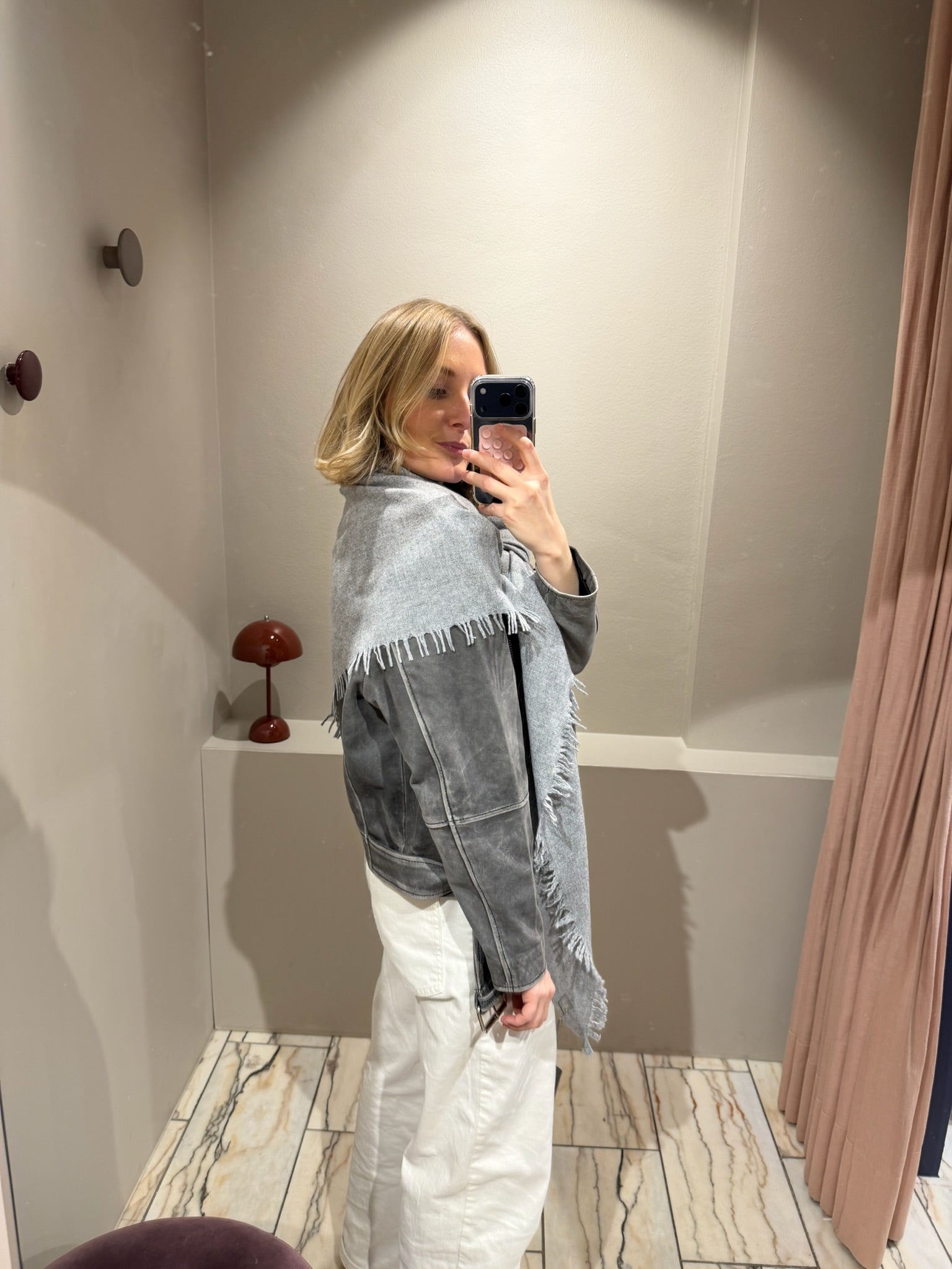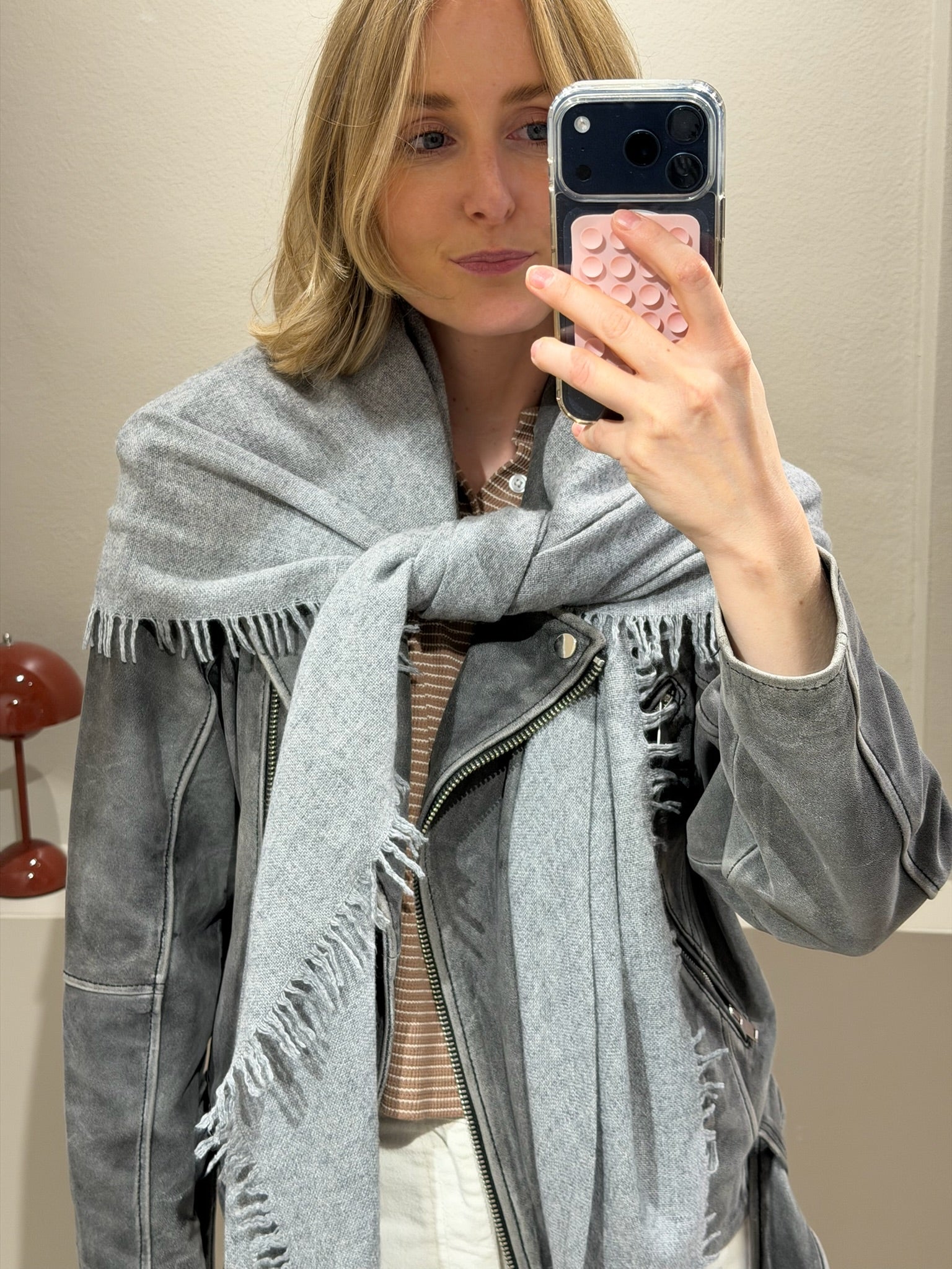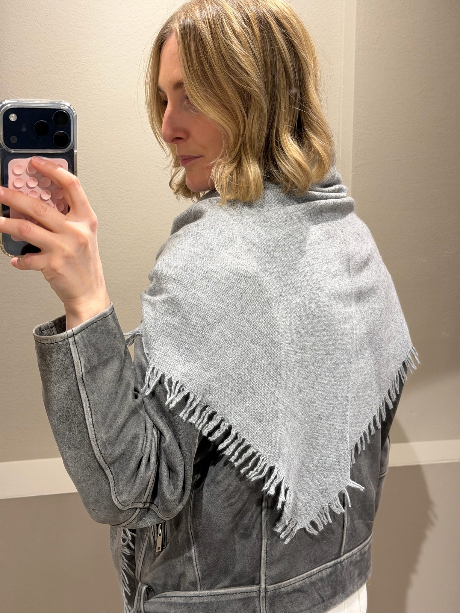 Graues Tuch aus einer Merino-Kaschmir Mischung mit Fransen an den Rändern. Die Tücher sind 100% made in Italien.