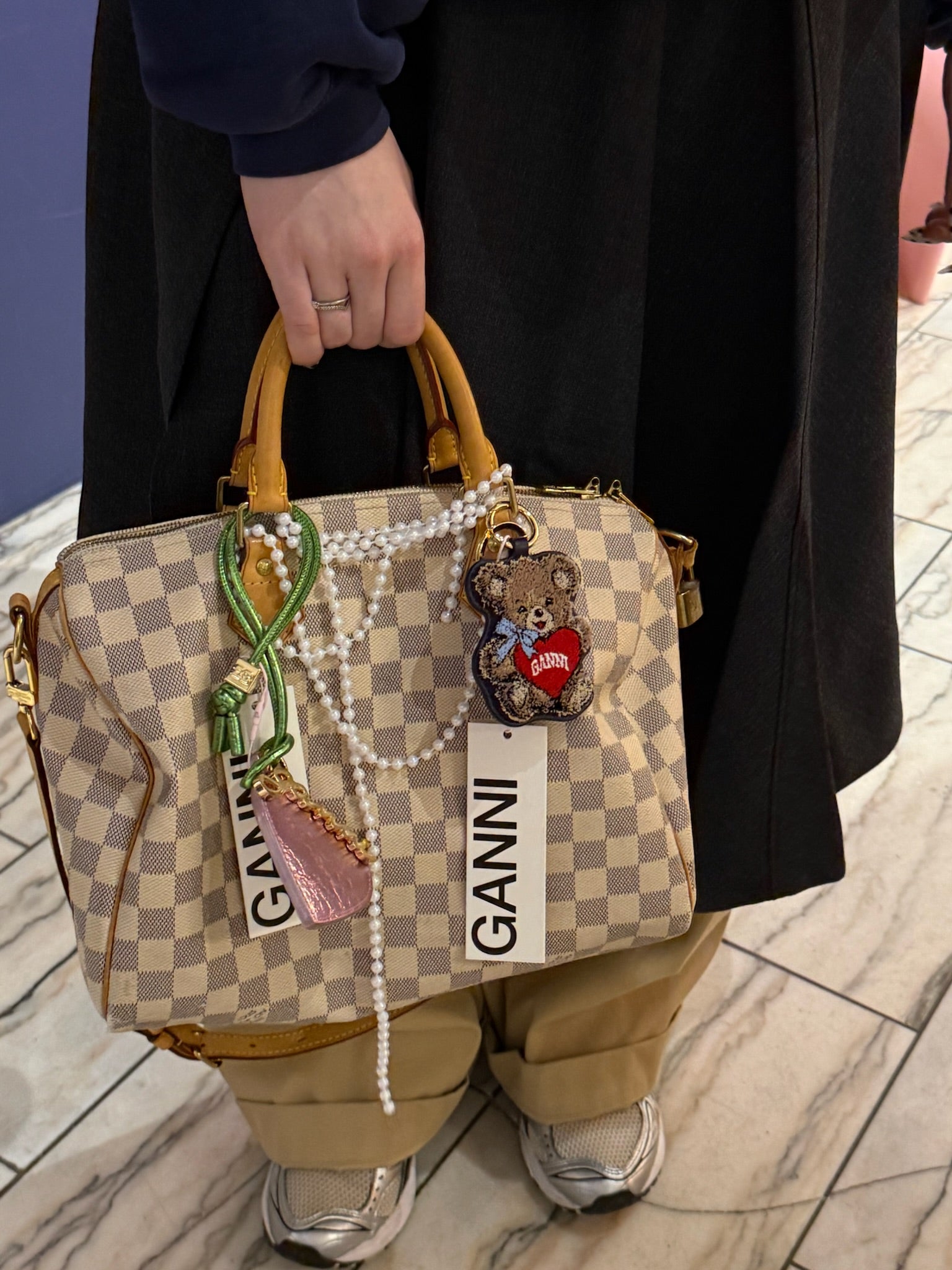 GANNI Bag Charm mit Spiegel. Er verfügt über einen Metallwürfel mit eingraviertem GANNI-Schriftzug und Schmetterling sowie ein GANNI-Logo.