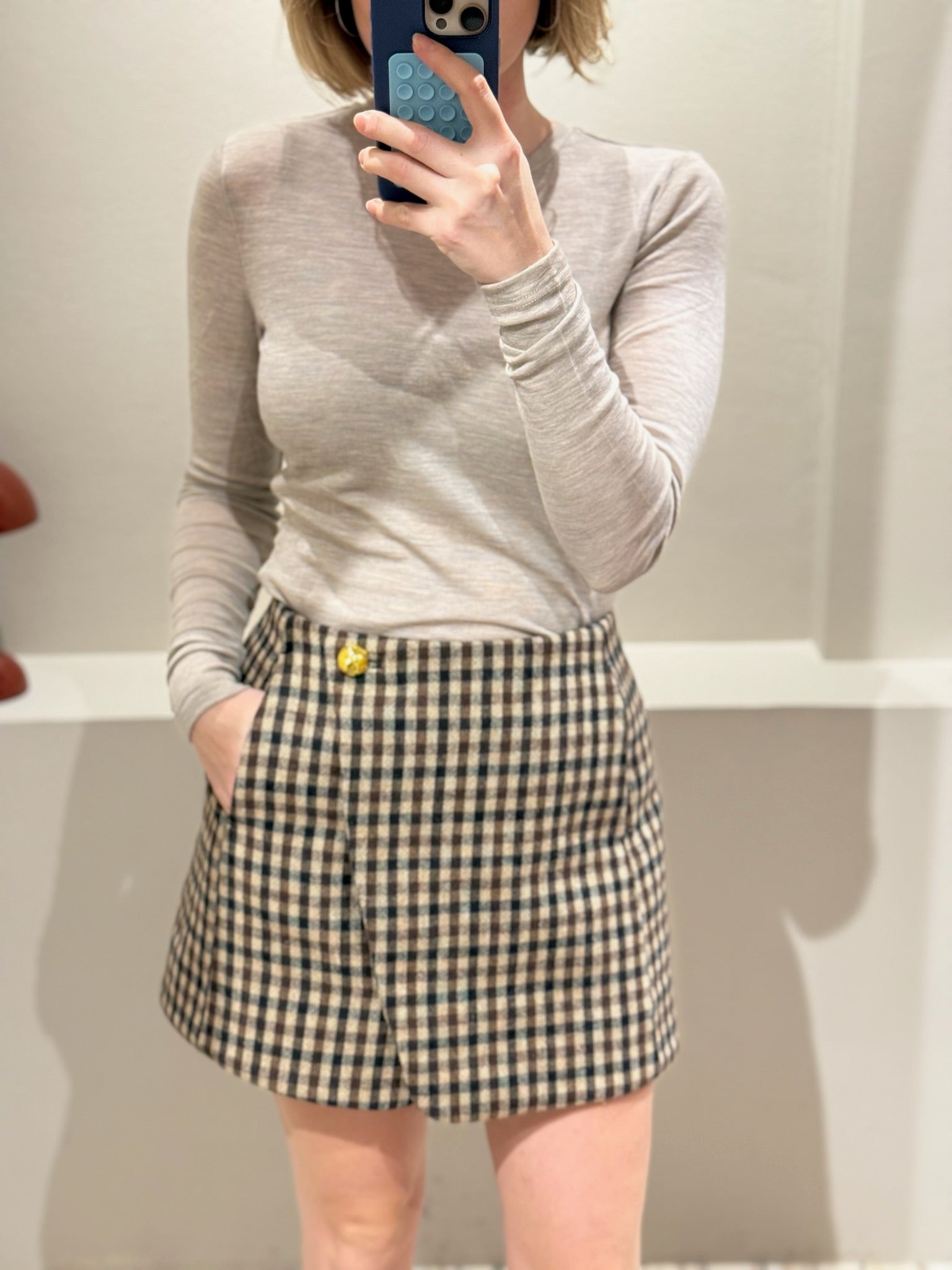 Minirock von GANNI mit klassischem Karomuster, gefertigt aus einer hochwertigen Wollmischung. Der Rock hat eine Wickeloptik und einen goldenen Knopfverschluss.