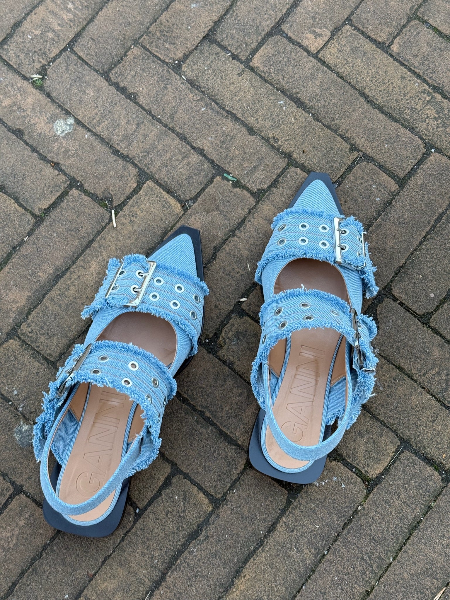 Spitzer Ballerina aus Denim mit Schnallen und Herz-Charm.