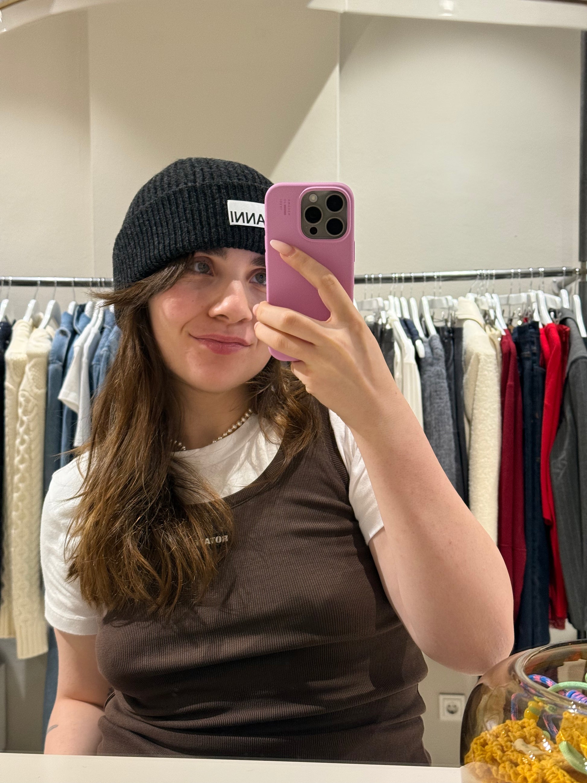 Dunkelgraue Beanie mit umgeschlagenen Bündchen mit GANNI Logoaufnäher.