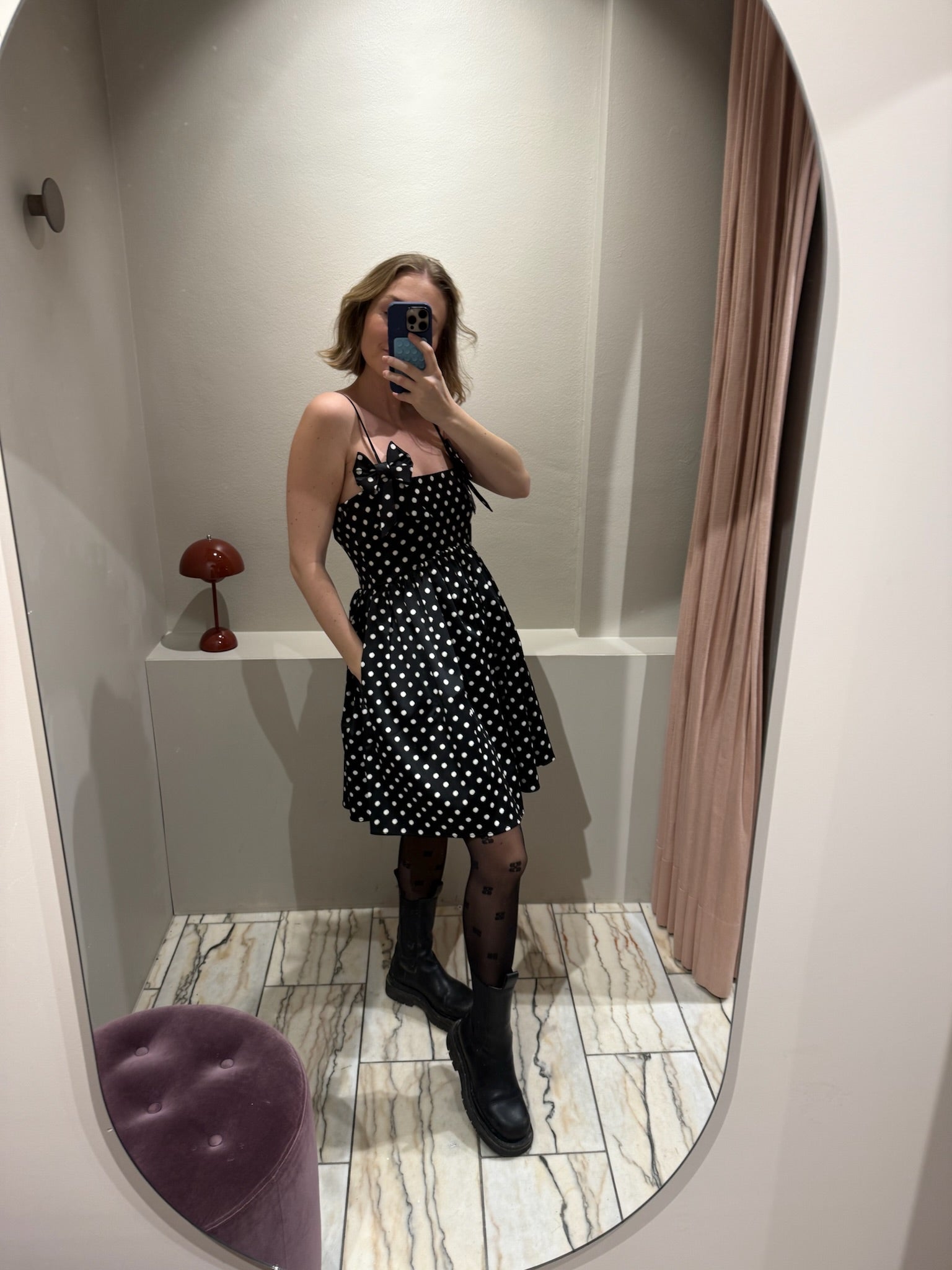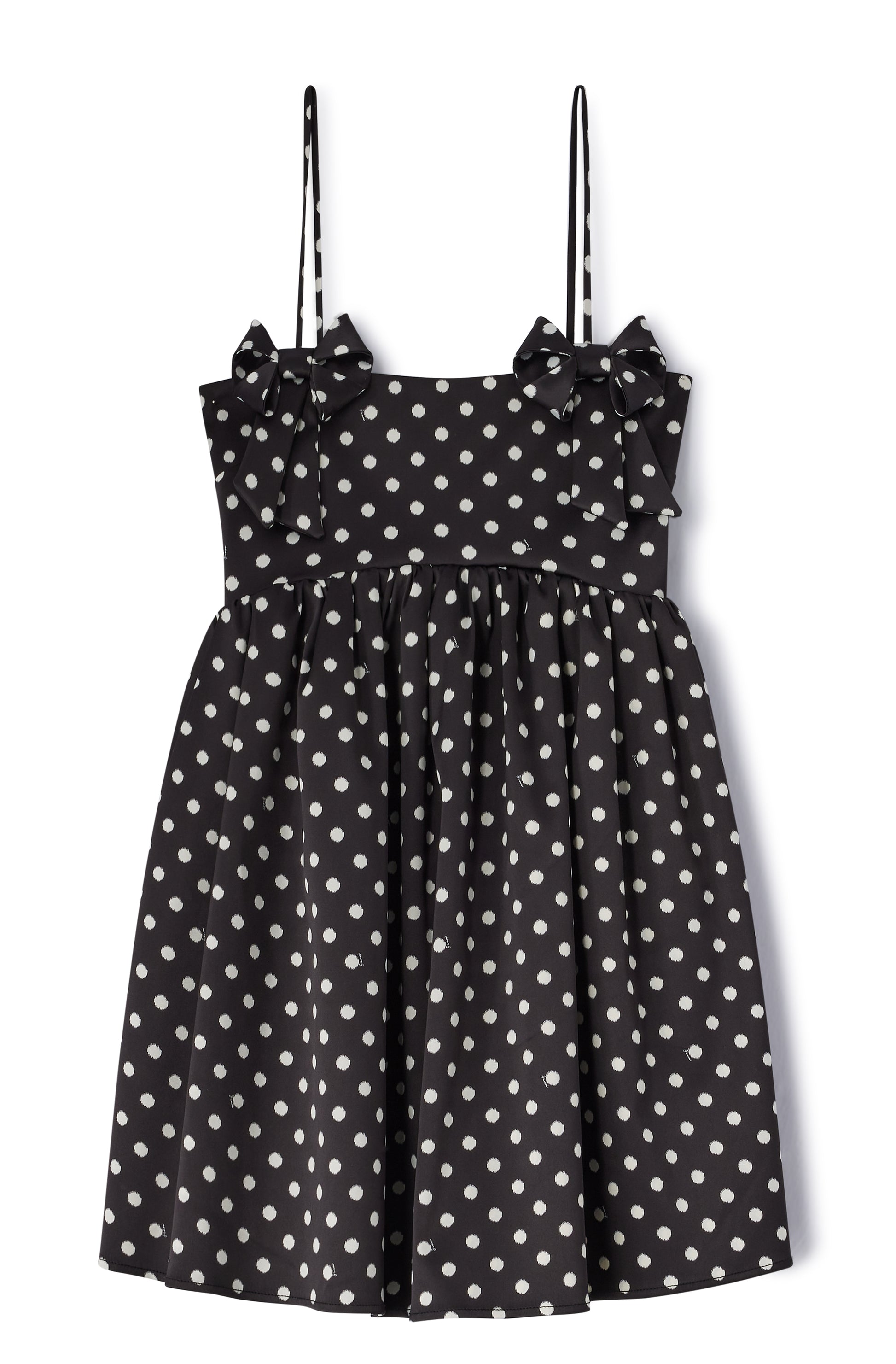 Schwarz-weiß gepunktetes Minikleid von Ganni mit Spaghettiträgern und Schleifendetails. Das Kleid hat einen geraden Ausschnitt, einen Reißverschluss und ein elastisches Rückenteil.