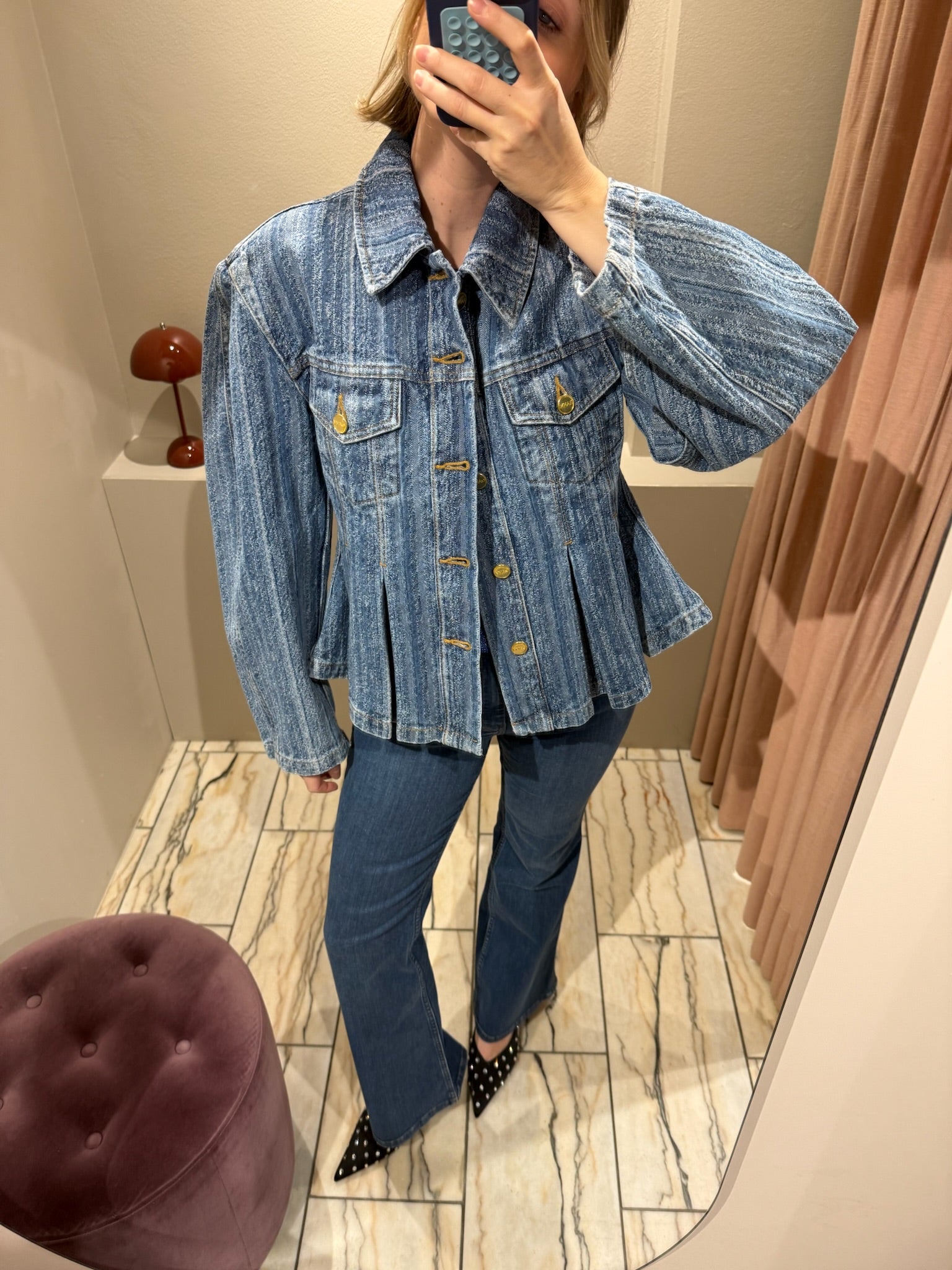 Diese Jeansjacke hat einen klassischen Kragen, einen Knopfverschluss auf der Vorderseite, Brusttaschen und ein plissiertes Taillendetail.