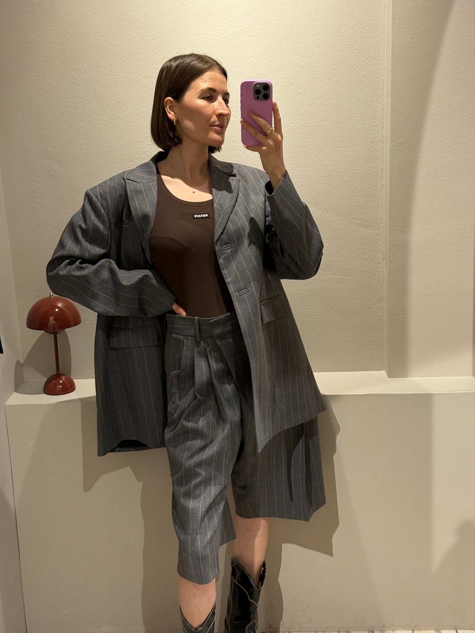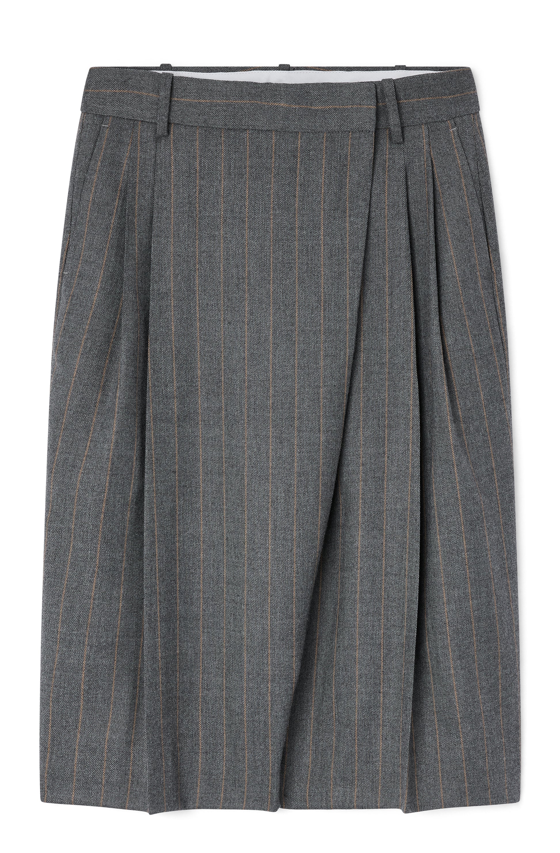 Graue Bermuda Shorts aus Wolle mit Nadelstreifen und Wickel-Optik. Die Shorts hat zudem zwei Seitentaschen und Gürtelschlaufen.
