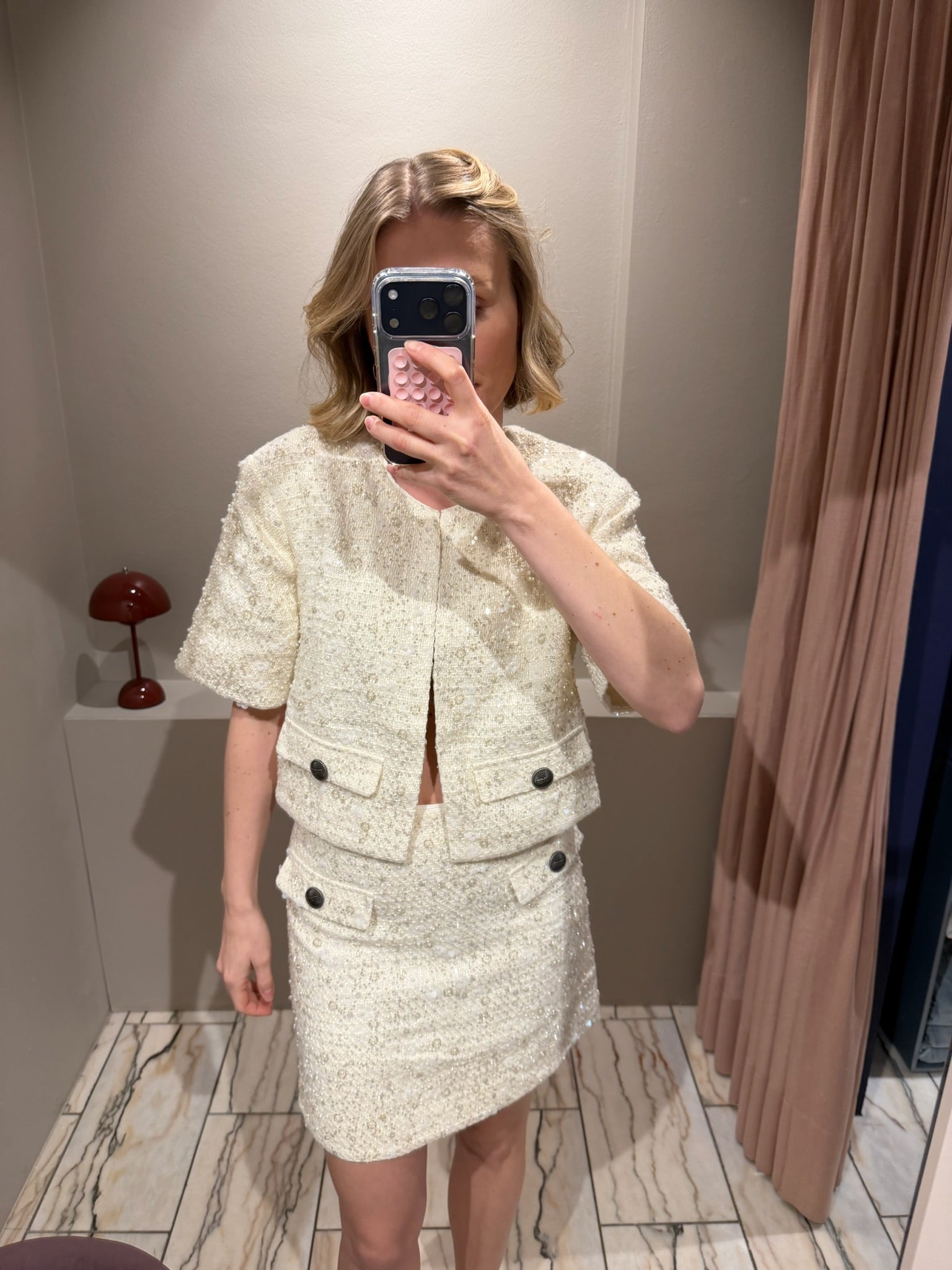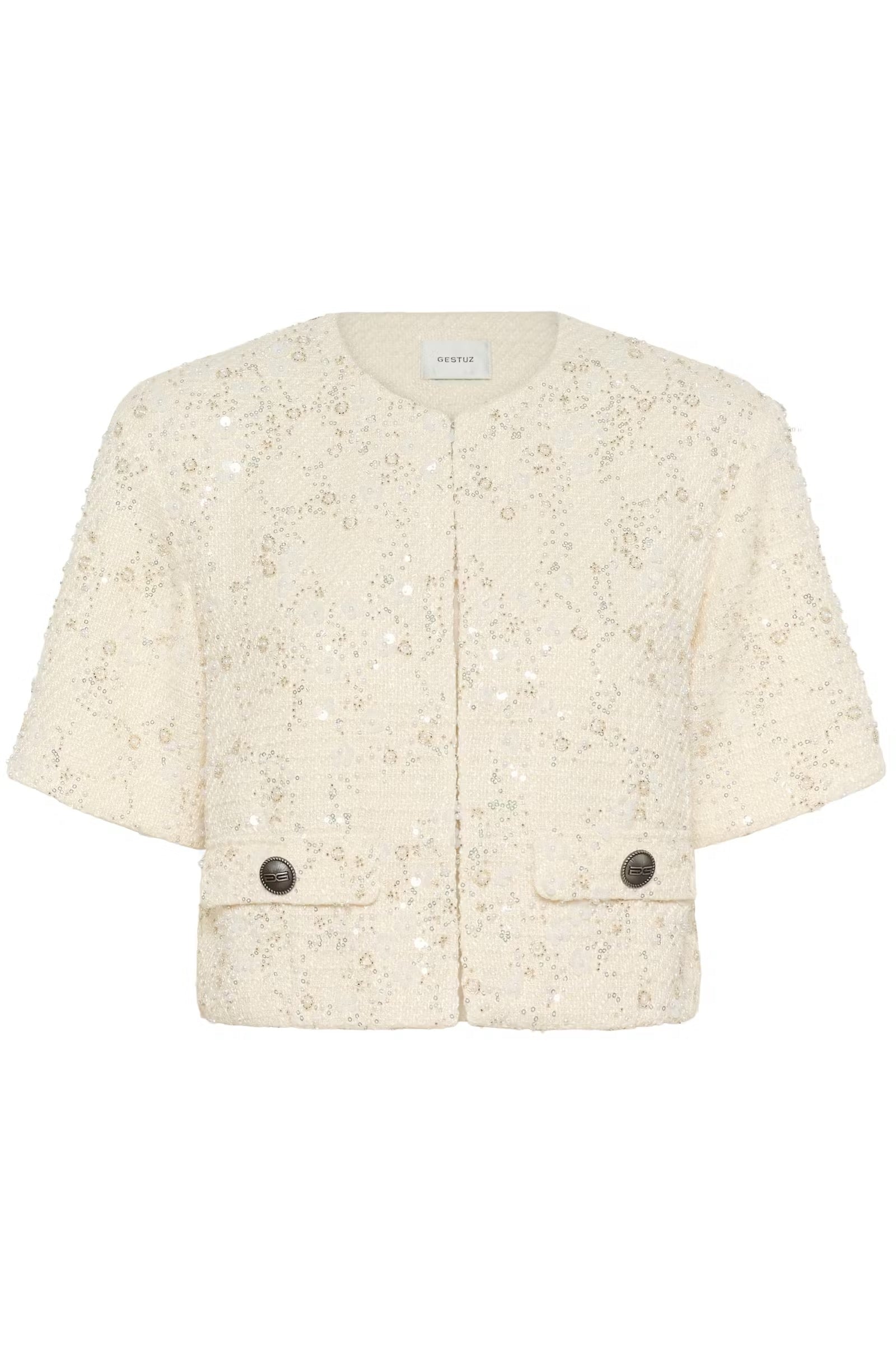 Kurzer, cremefarbener Blazer mit kleinen Pailletten. Er hat einen cropped Schnitt, einen Rundhalsausschnitt und eine lockere Passform. Zwei Pattentaschen bieten praktische Details.