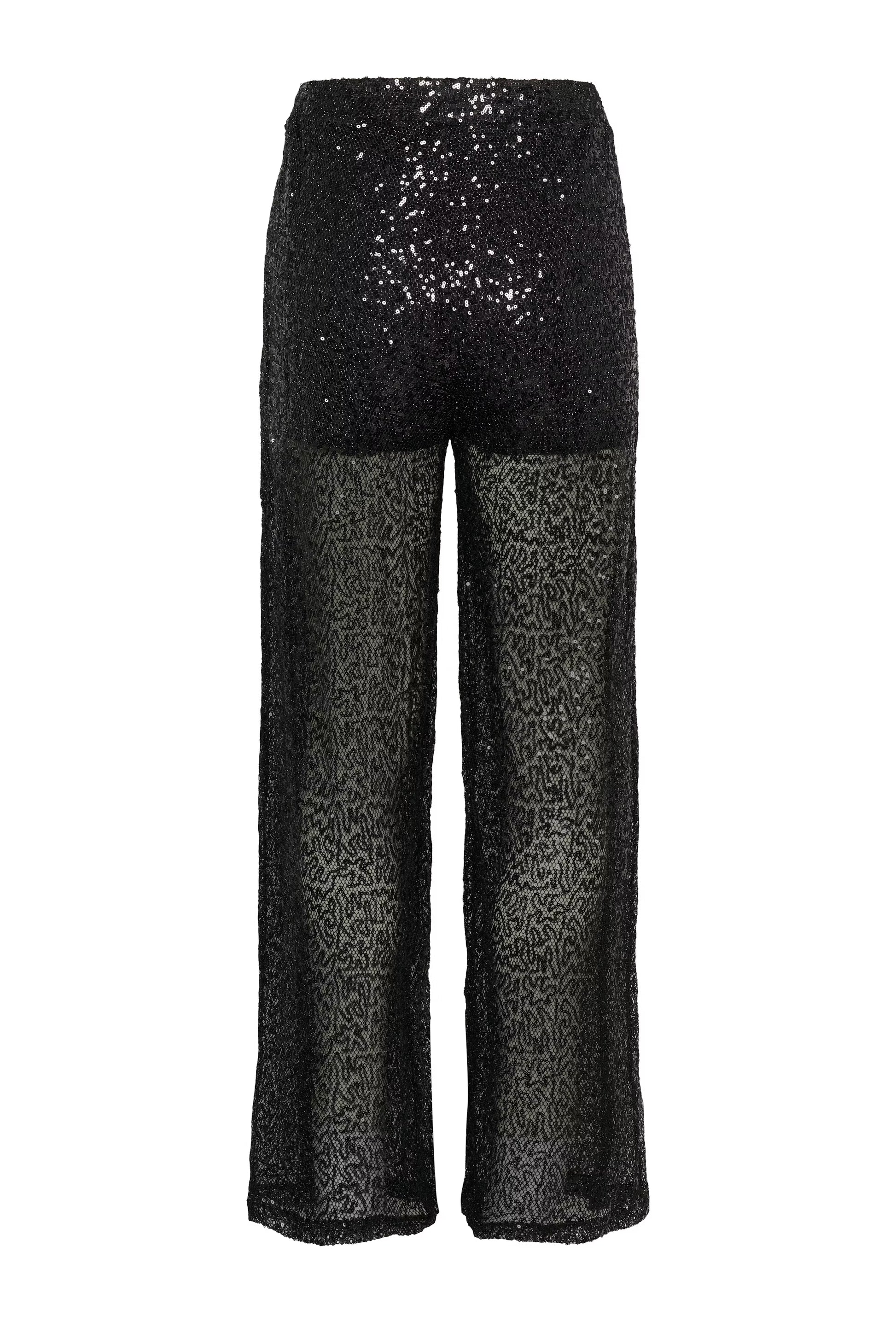 Transparente Paillettenhose mit weitem Bein, hoher Taille und integrierter Shorts. Gefertigt aus leichtem Mesh mit fließendem Fall und schimmerndem Finish. Ideal für die nächste Party-Nacht!