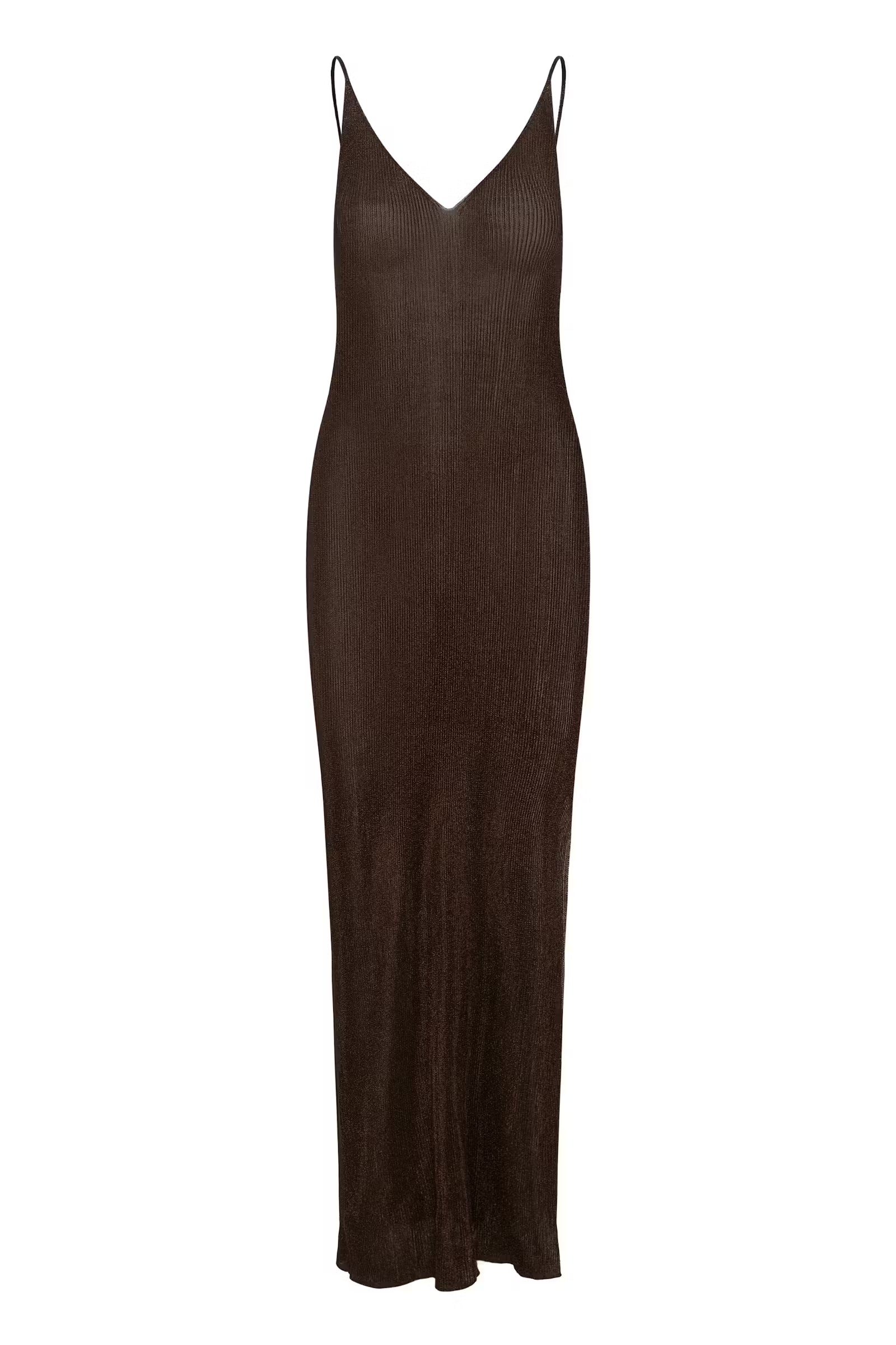 Braunes, transparentes metallic Maxikleid mit figurbetonter Silhouette, tiefem V-Ausschnitt, feinen Trägern und seitlichem Schlitz.