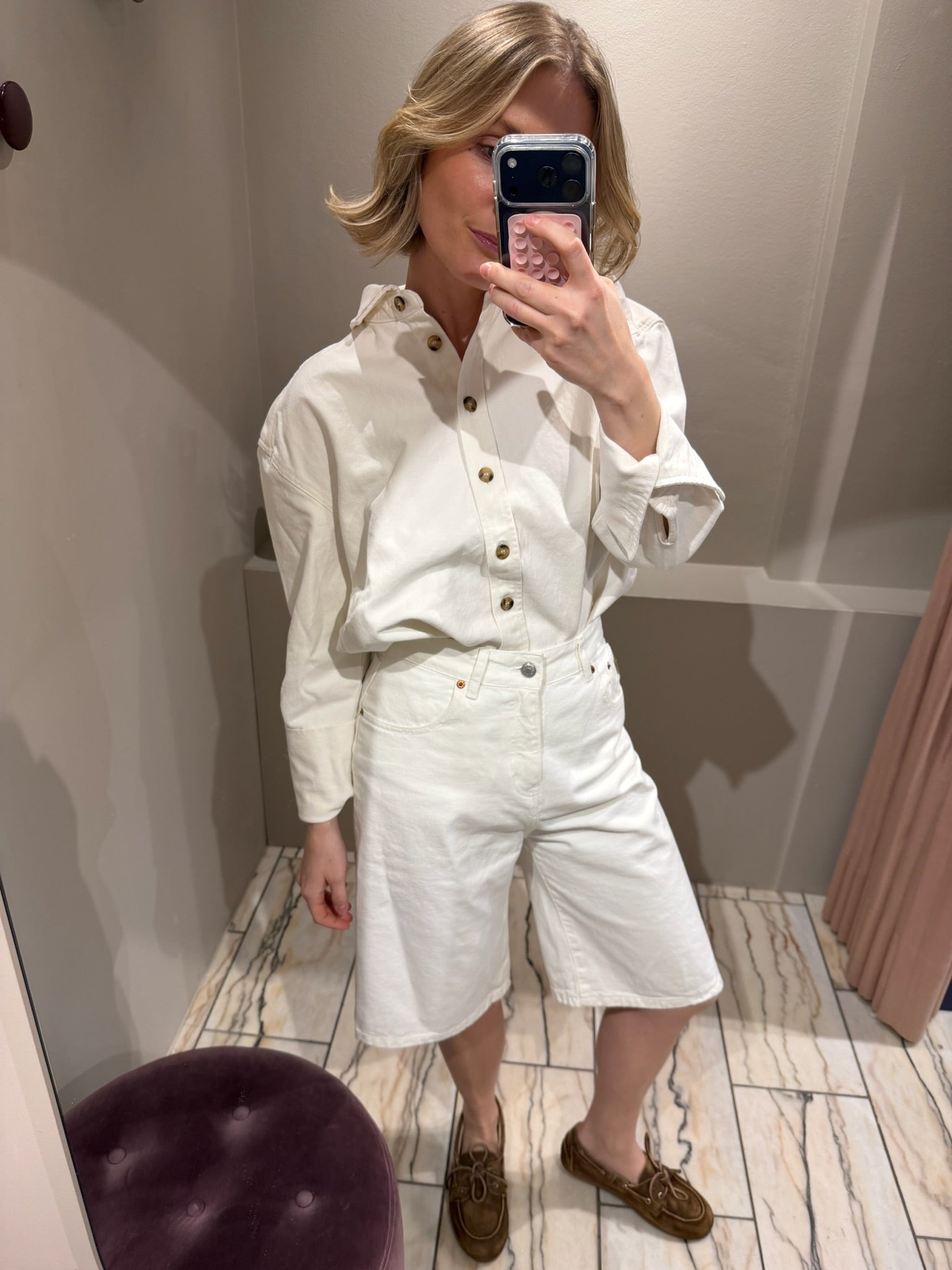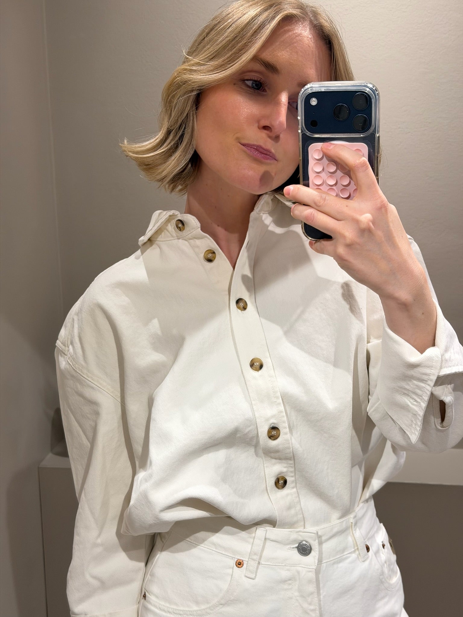 Weißes Jeanshemd mit langen Ärmeln, Knopfleiste und Knopfmanschetten.