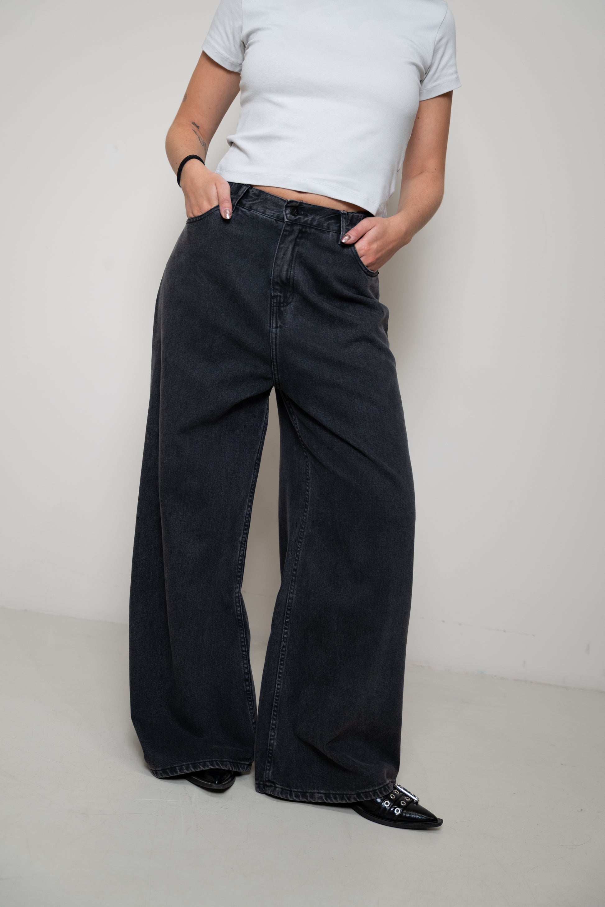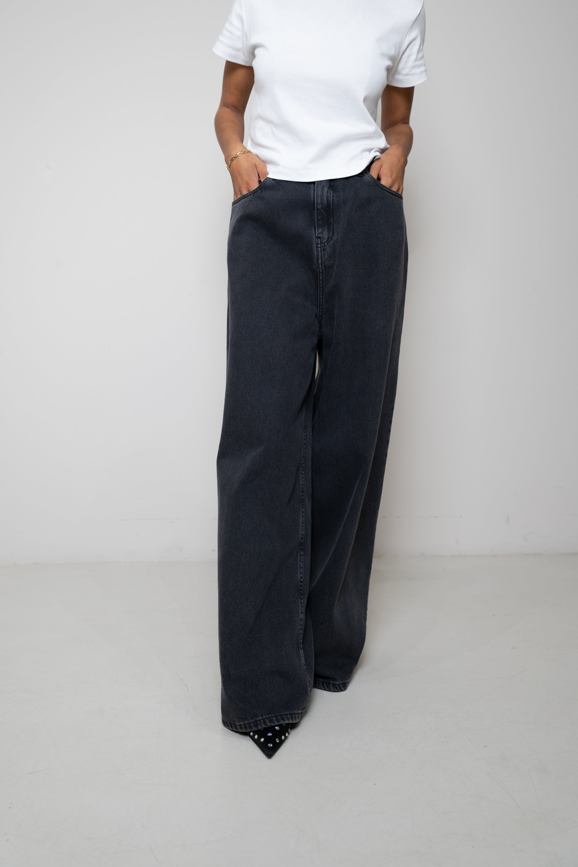 Extra weite Jeans in grauer Waschung. Die Jeans hat einen hohe Bundhöhe und einen Gummizug auf der Rückseite.