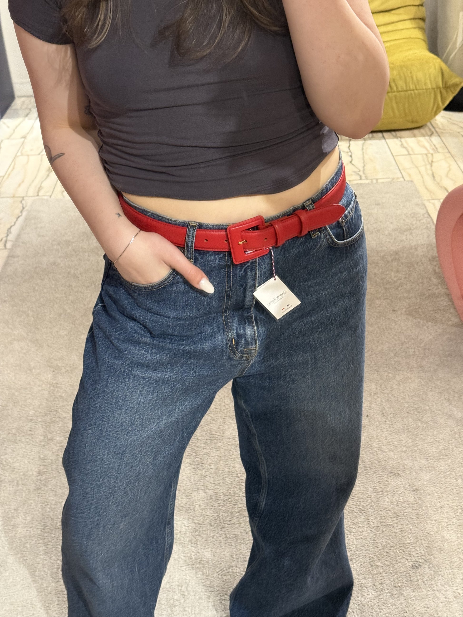 Roter Ledergürtel mit lederüberzogener Schnalle.