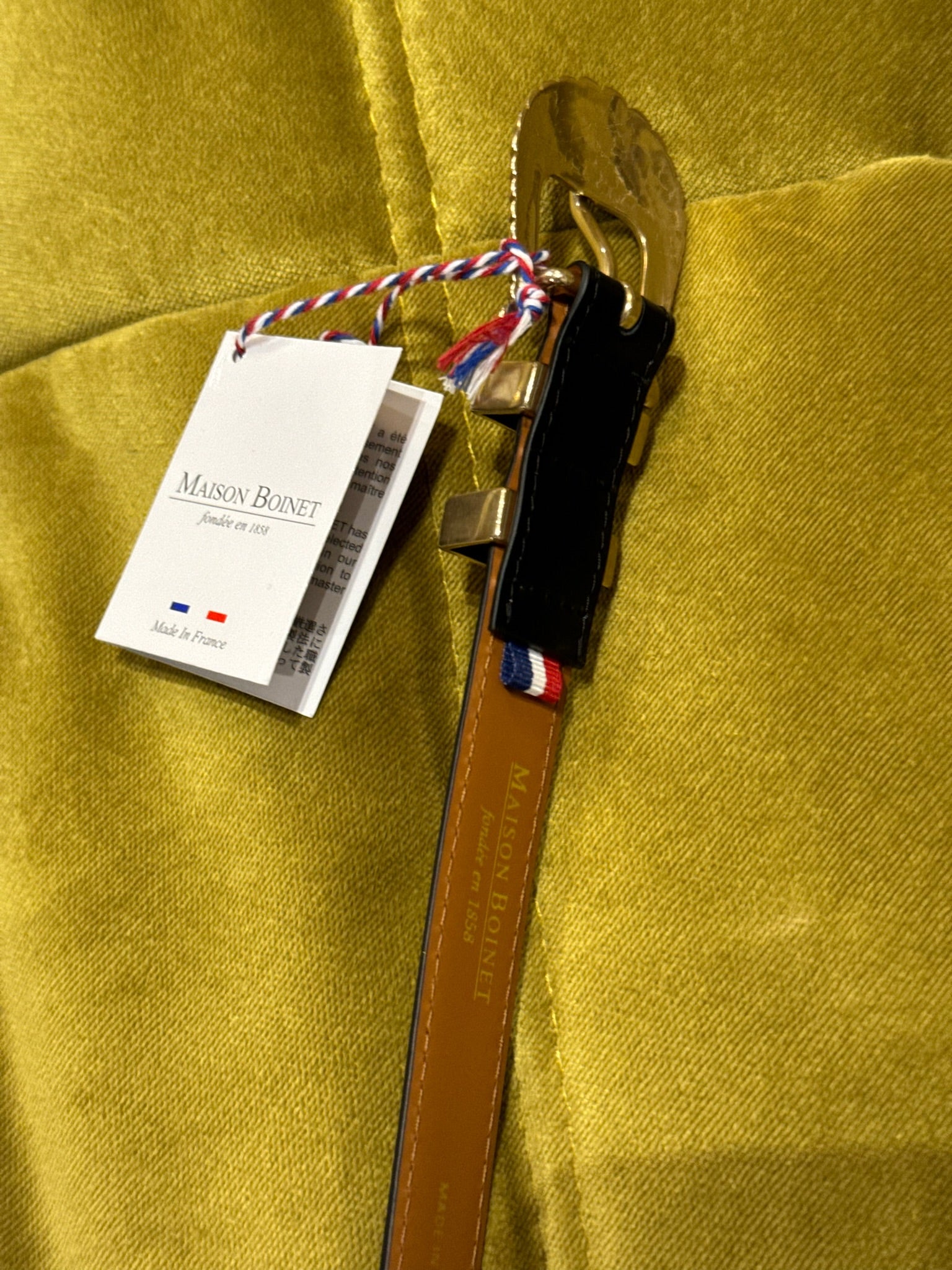 Schmaler Gürtel mit dekorierter Schnalle in Gold.