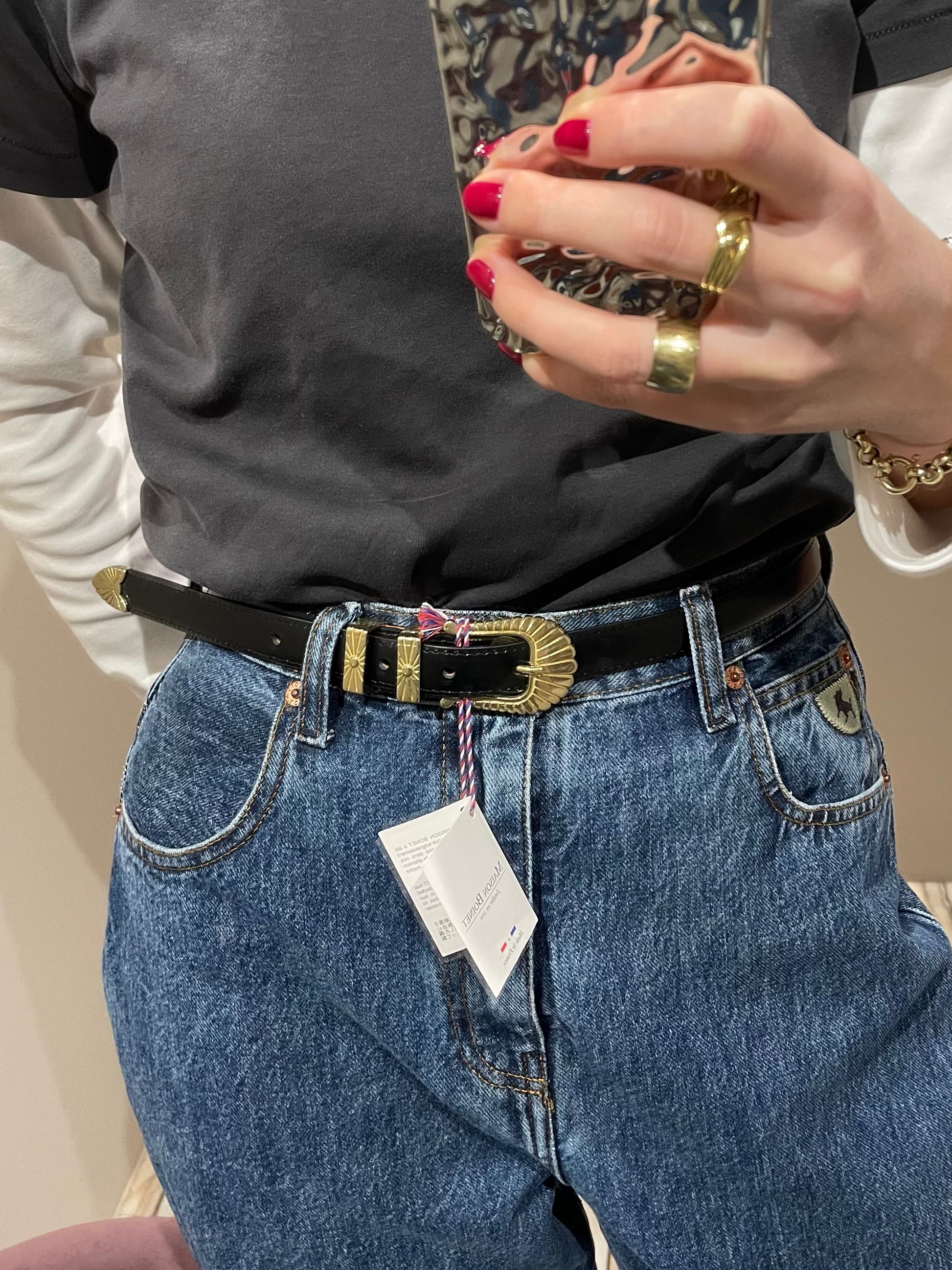 Schmaler schwarzer Gürtel mit dekorierter Schnalle in Gold.