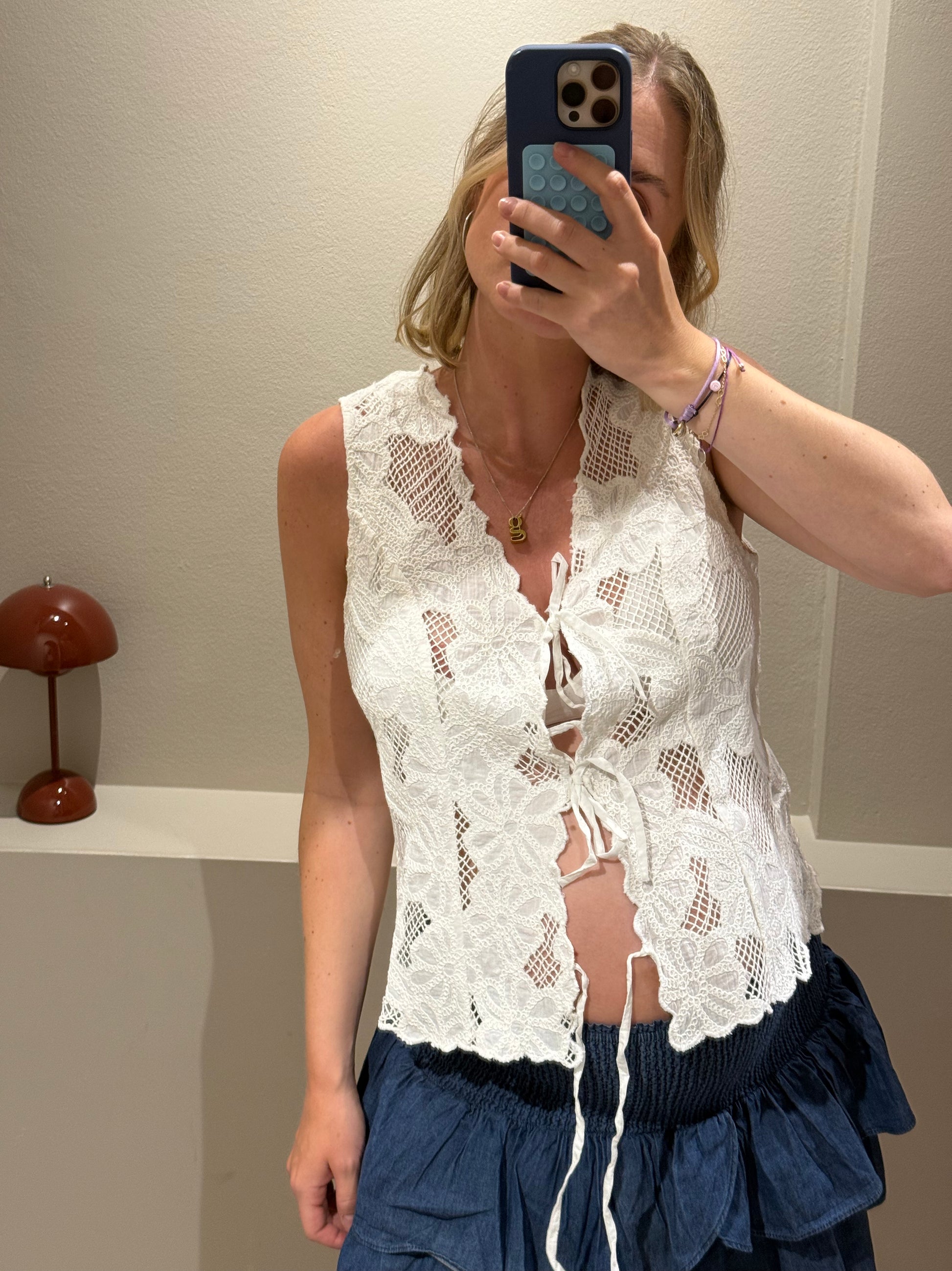 Romantisch, luftig und vielseitig: Diese weiße Spitzenweste ist ein echtes Highlight für sommerliche Layering-Looks. Aus semitransparenter Spitze mit zartem Blumenmuster gefertigt, verleiht sie jedem Outfit eine feminine Note. Die Vorderseite wird mit süßen Schleifen gebunden – ein verspieltes Detail, das gleichzeitig praktisch ist. Ob über einem Top, Kleid oder Bikini getragen – die Weste sorgt für Leichtigkeit und Stil.