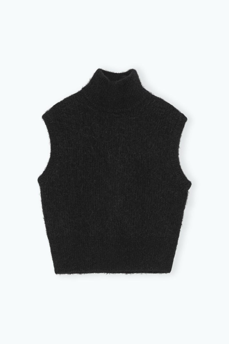Die Crew Neck Vest Black ist ein ärmelloses Stricktop aus einer weichen Mischung aus Alpaka, Wolle, Nylon und Elastan. Mit hohem Rundhalsausschnitt und gerippten Abschlüssen überzeugt sie durch eine klare, strukturierte Silhouette. Die feine Stricktextur verleiht zusätzliche Tiefe und macht das Top vielseitig kombinierbar. Perfekt abgestimmt mit dem Knit Midi Skirt Black ergibt sich ein elegantes Co-Ord-Set.