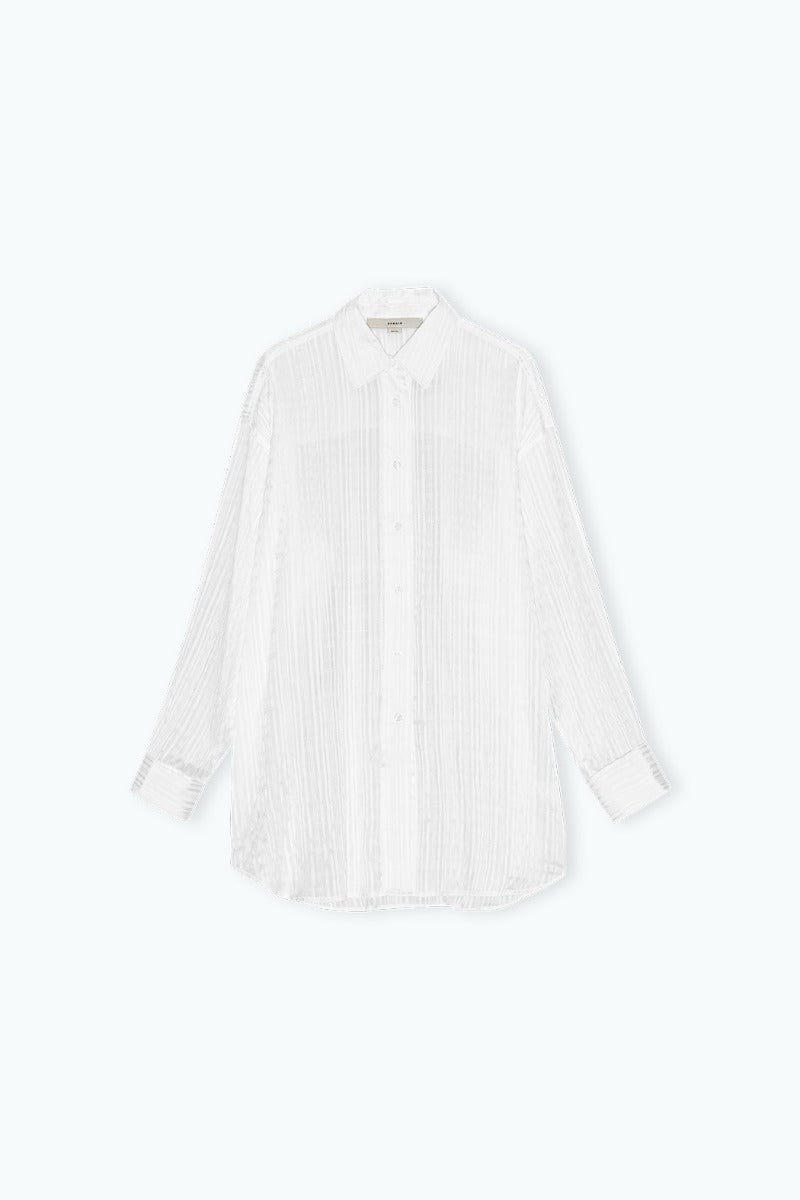 Das Oversized Shirt Bright White ist aus einem semitransparenten Stoff mit gewebter Karostruktur gefertigt und verleiht jedem Look eine leichte, moderne Note. Das Hemd ist mit einem spitzen Kragen, einer durchgehenden Knopfleiste, langen Ärmeln mit geknöpften Manschetten sowie einem abgerundeten Saum gestaltet. Durch den oversized Schnitt entsteht eine entspannte Silhouette mit zeitlosem Charakter.