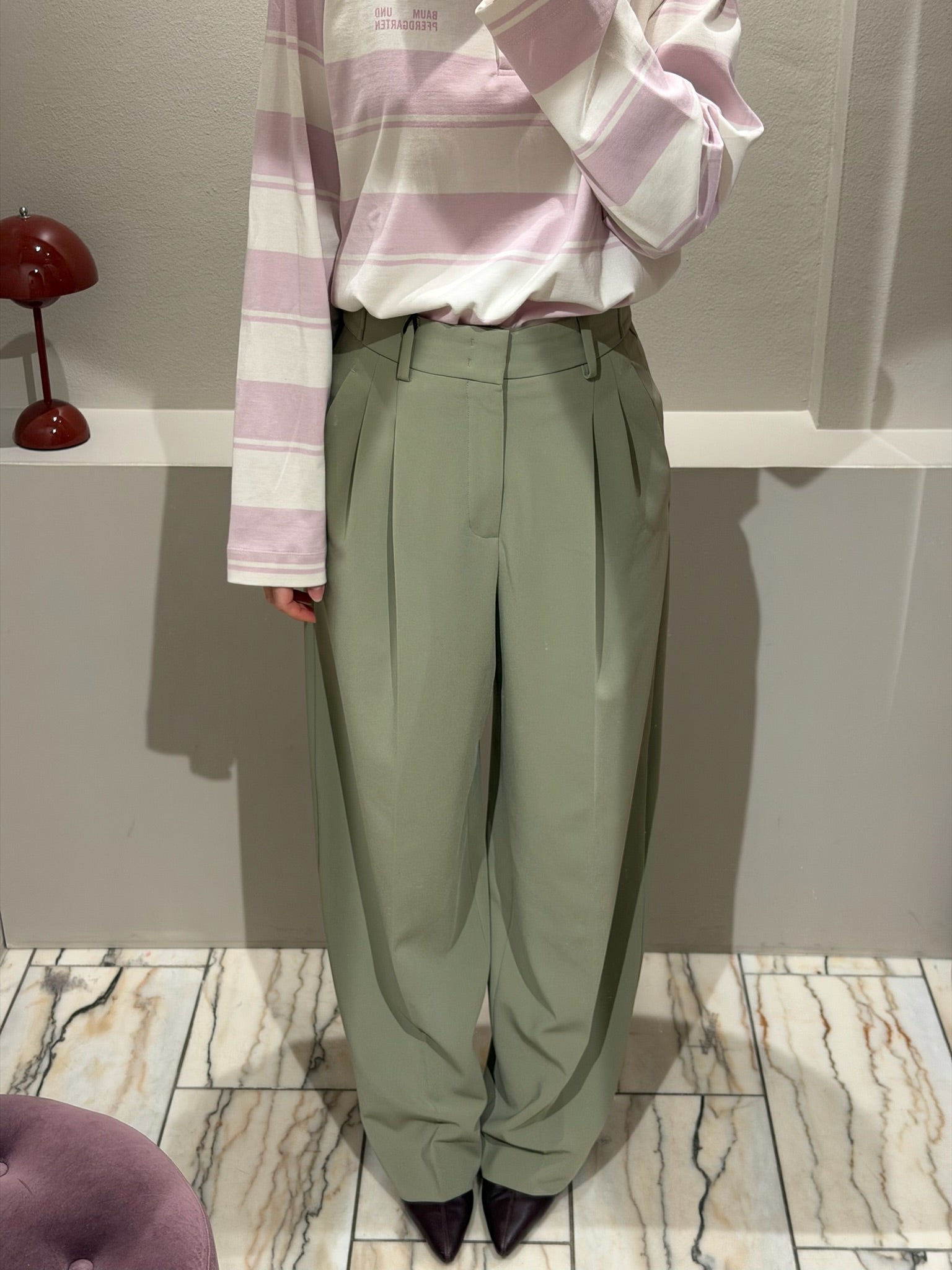 Olivegrüne Bundfaltenhose mit höherer Leibhöhe und einem weitem Bein. Die Hose hat einen verstellbaren Innenbund für eine perfekte Passform.