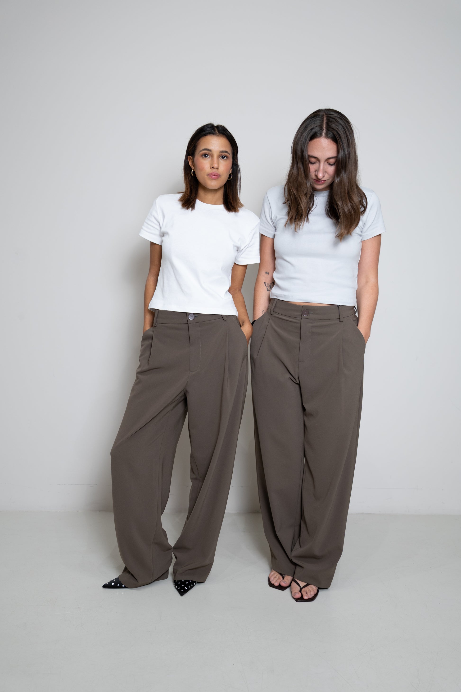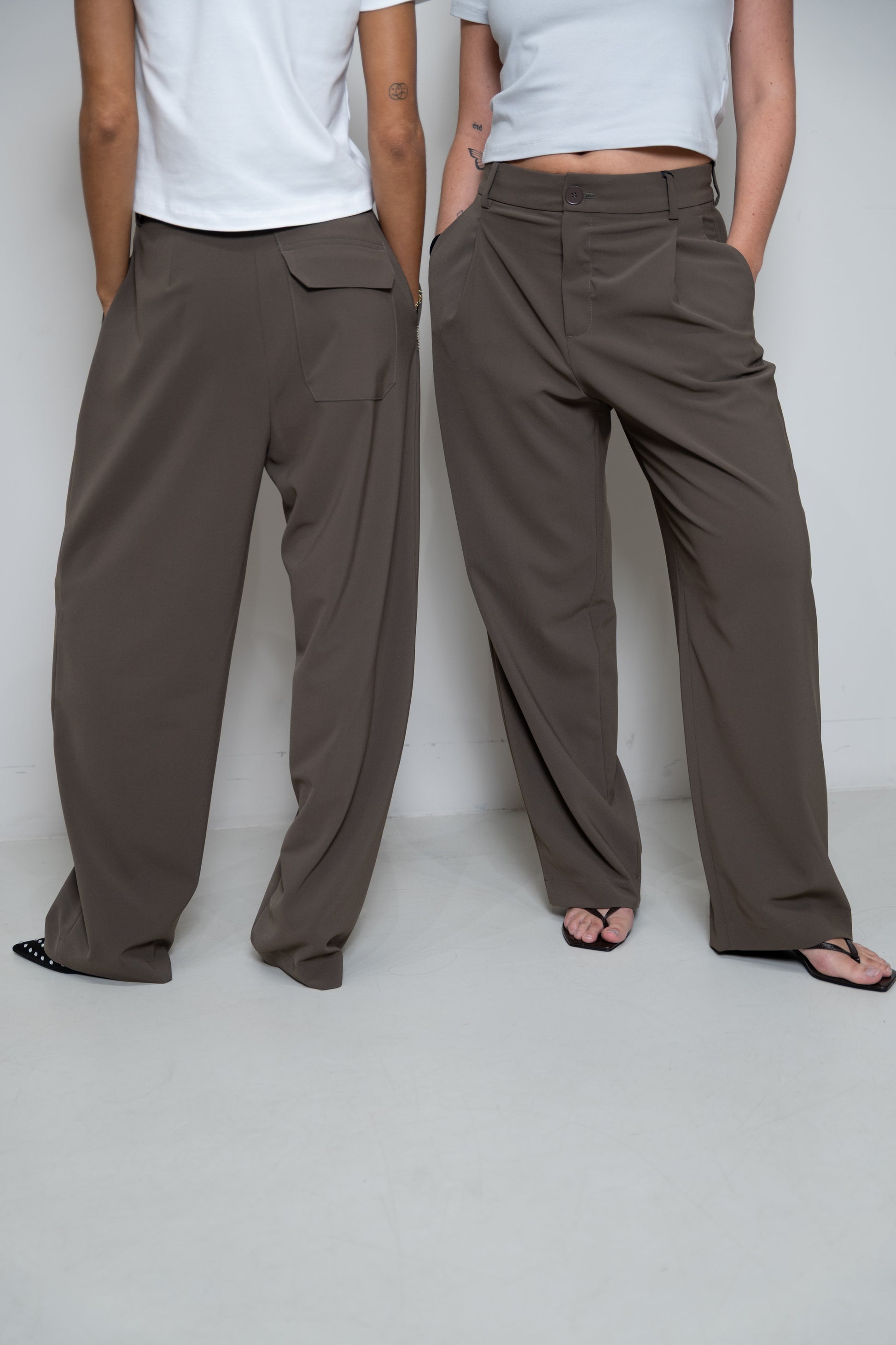 Weite Anzugshose in schönem Taupe-Khaki und einfacher Bundfalte. Die Hose kann man innen mit Knöpfen in der Größe verstellen um die Passform anzupassen.