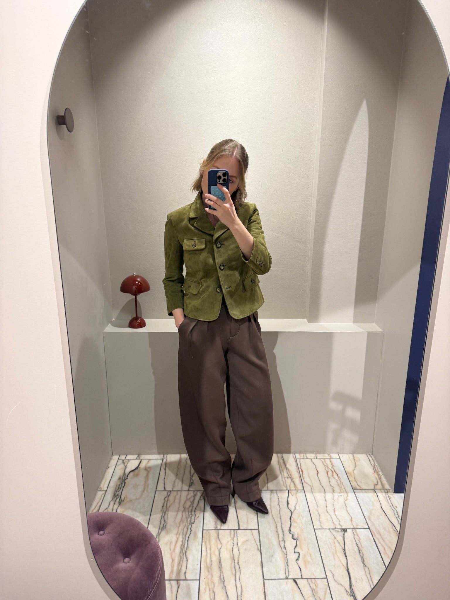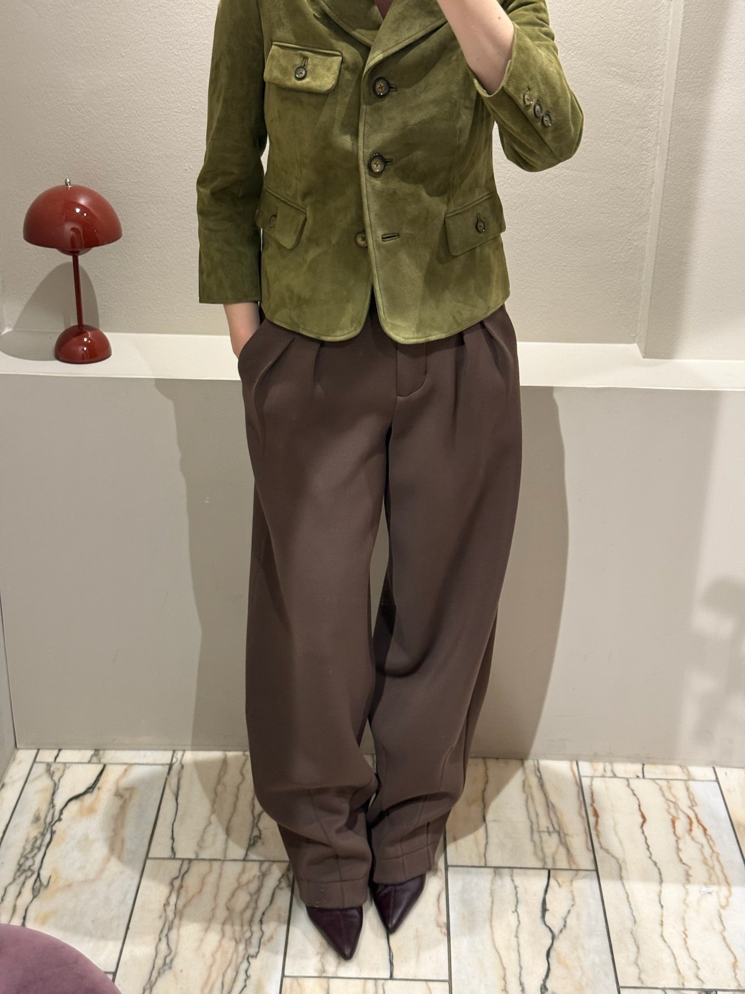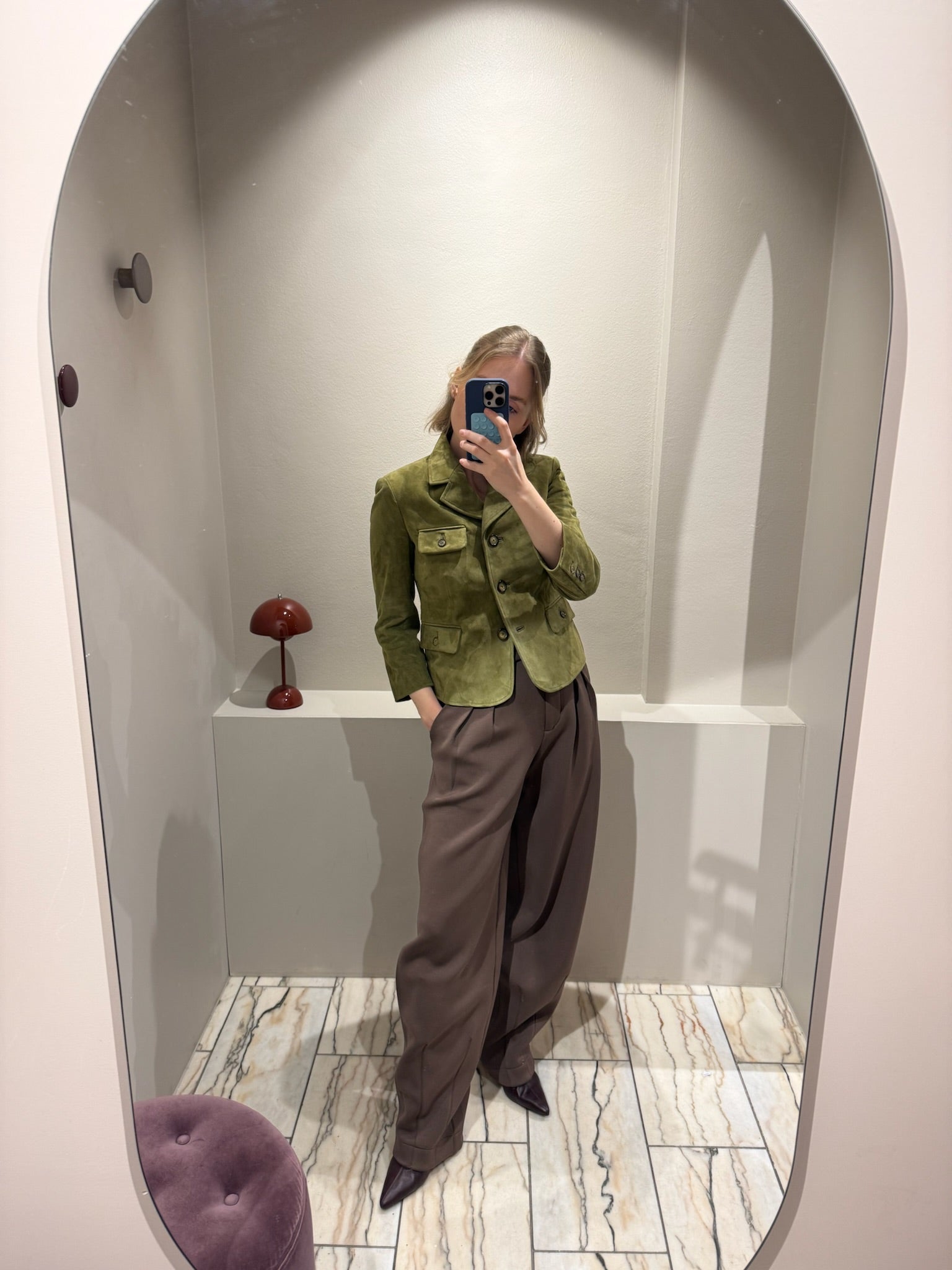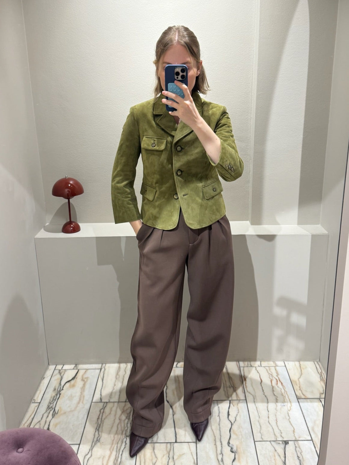 Weite Anzugshose in schönem Taupe und einfacher Bundfalte. Die Hose kann man innen mit Knöpfen in der Größe verstellen um die Passform anzupassen.