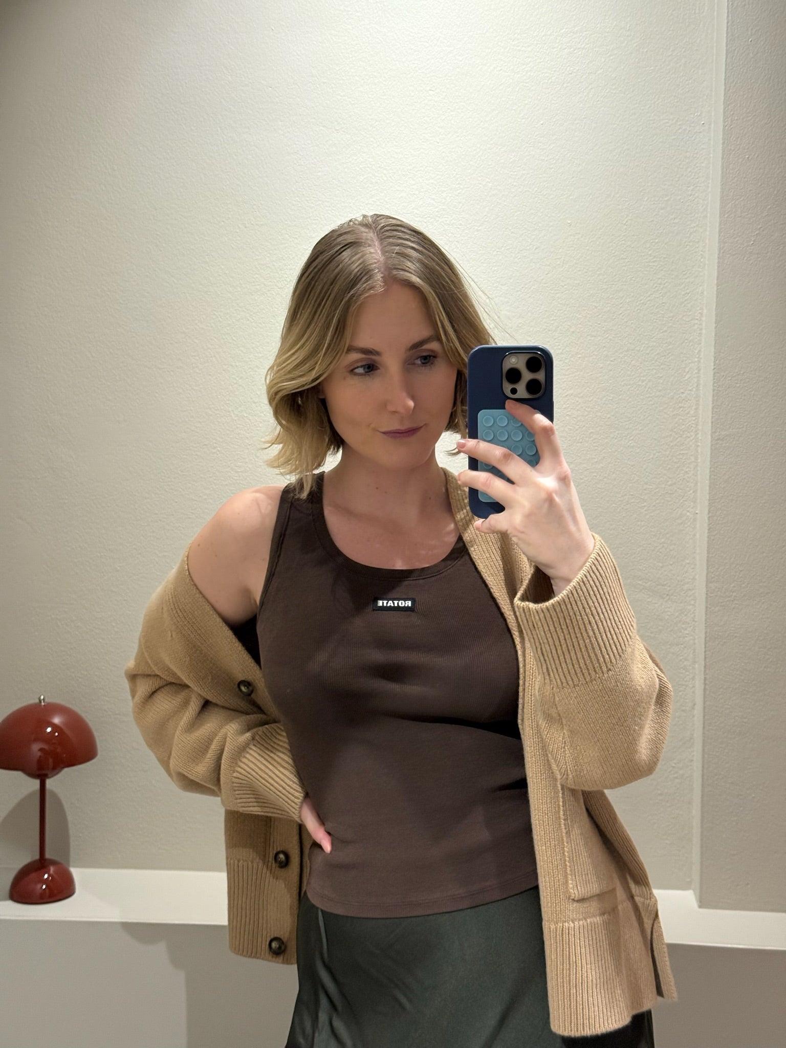 Braunes, ärmelloses Tanktop von Rotate mit rundem Ausschnitt und einem figurnahen Schnitt. Das Top hat das kleine Rotate-Logo auf der Brust.
