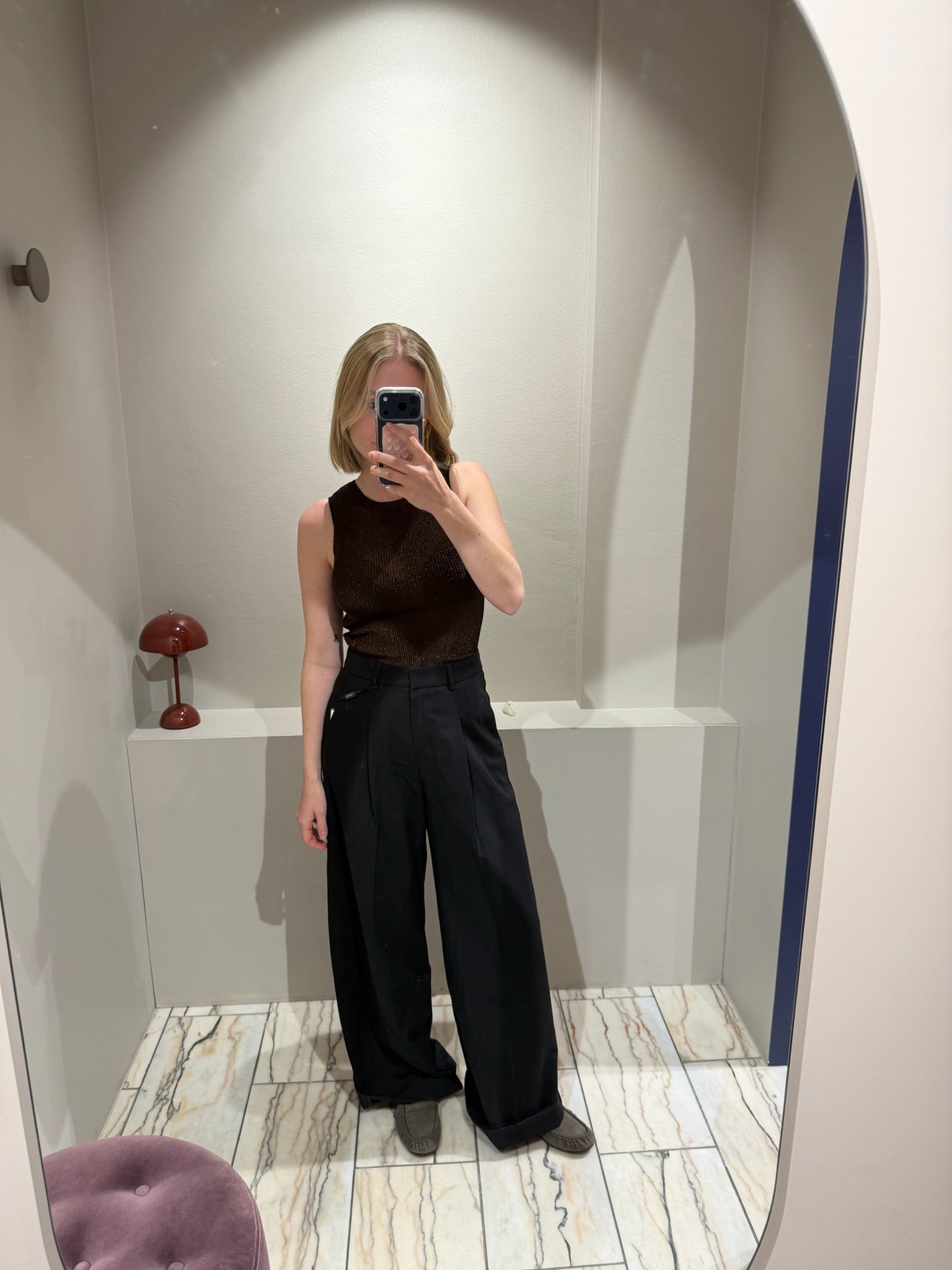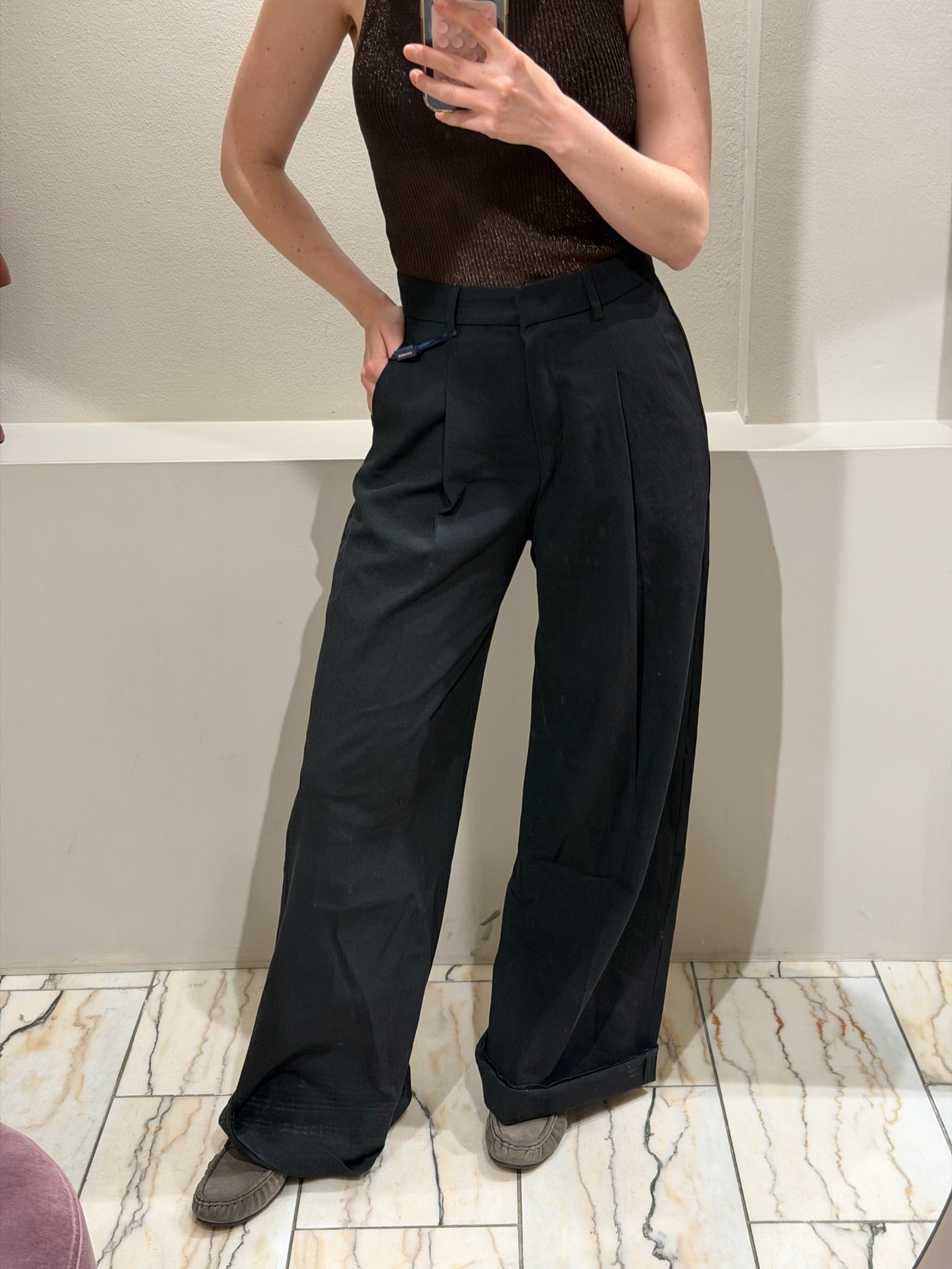 Schwarze Bundfaltenhosen aus einem leichten Leinenmaterial. Die Hose hat eine höhere Leibhöhe, Bügelfalten und ein weites Bein.