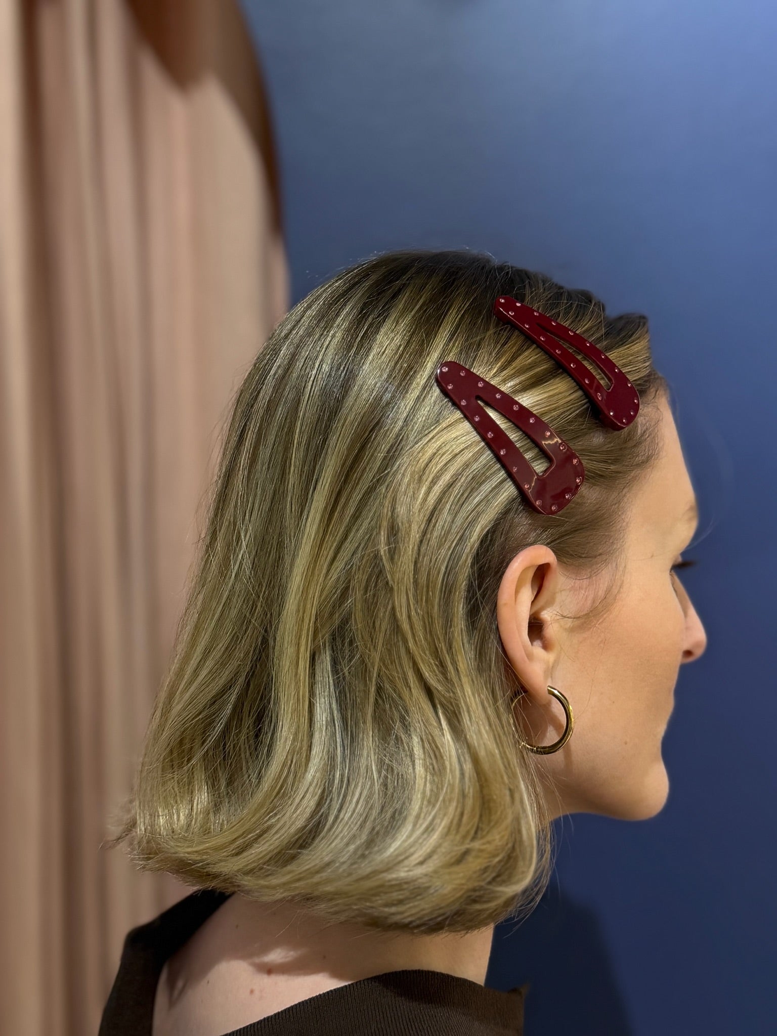 Das 2er-Pack Haarklammern in Burgundy bringt ein bisschen Glam in jeden Look. Die kleinen Strasssteine catchen das Licht super schön und setzen dezente Highlights im Haar. Perfekt für jeden Tag oder als funkelndes Detail für besondere Anlässe.