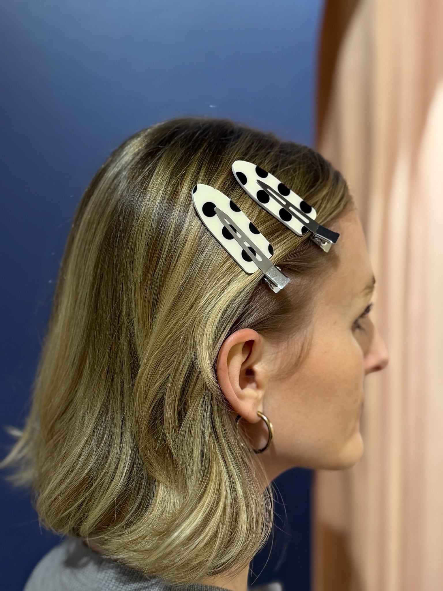 Weiße Haarklammern mit schwarzem Punktdesign.