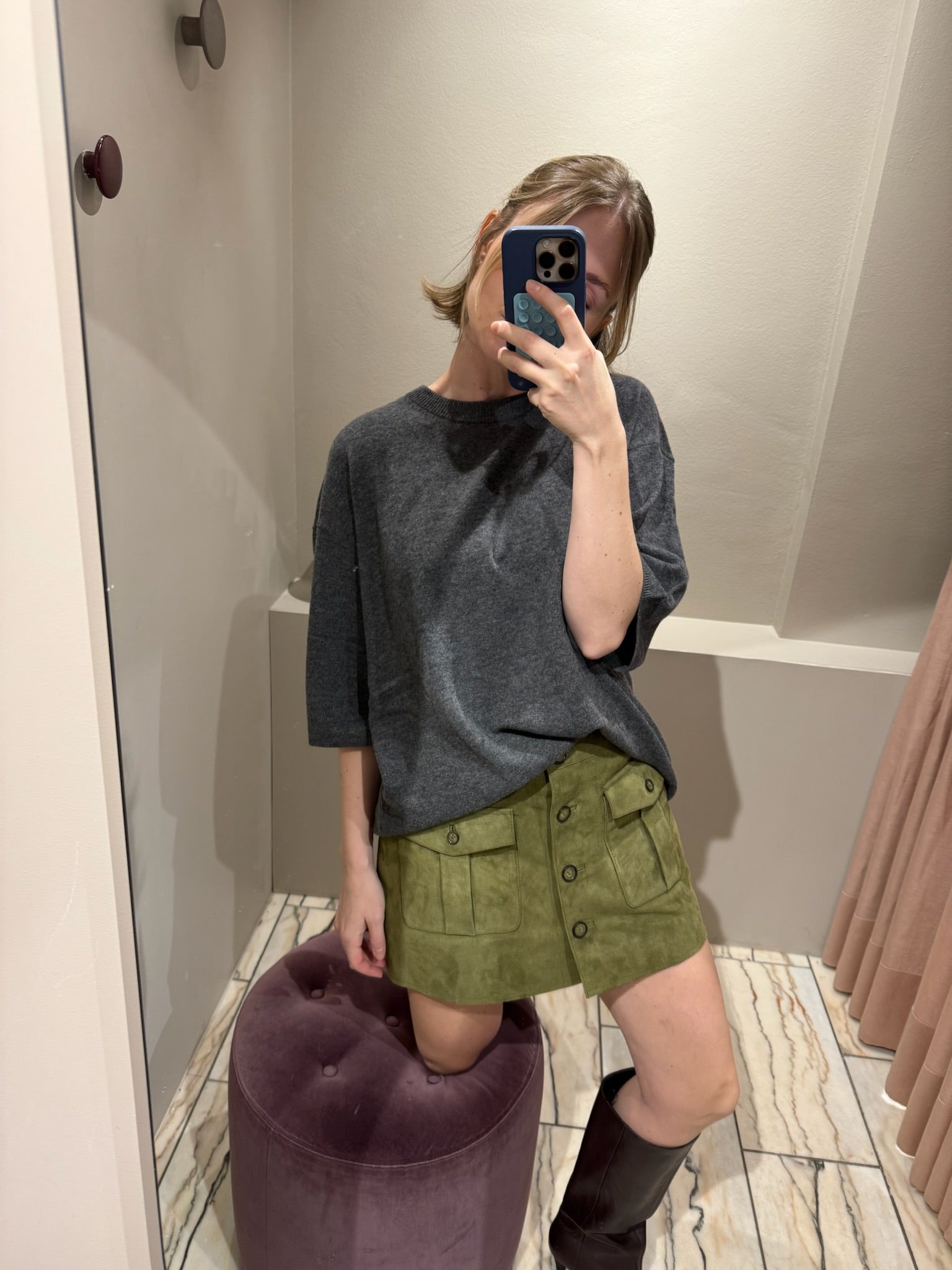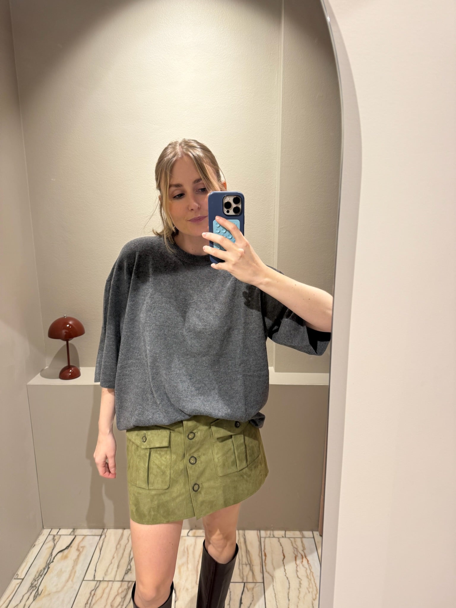 Dunkelgraues Strickoberteil mit kurzen Ärmeln, rundem Ausschnitt und einer oversized Passform.