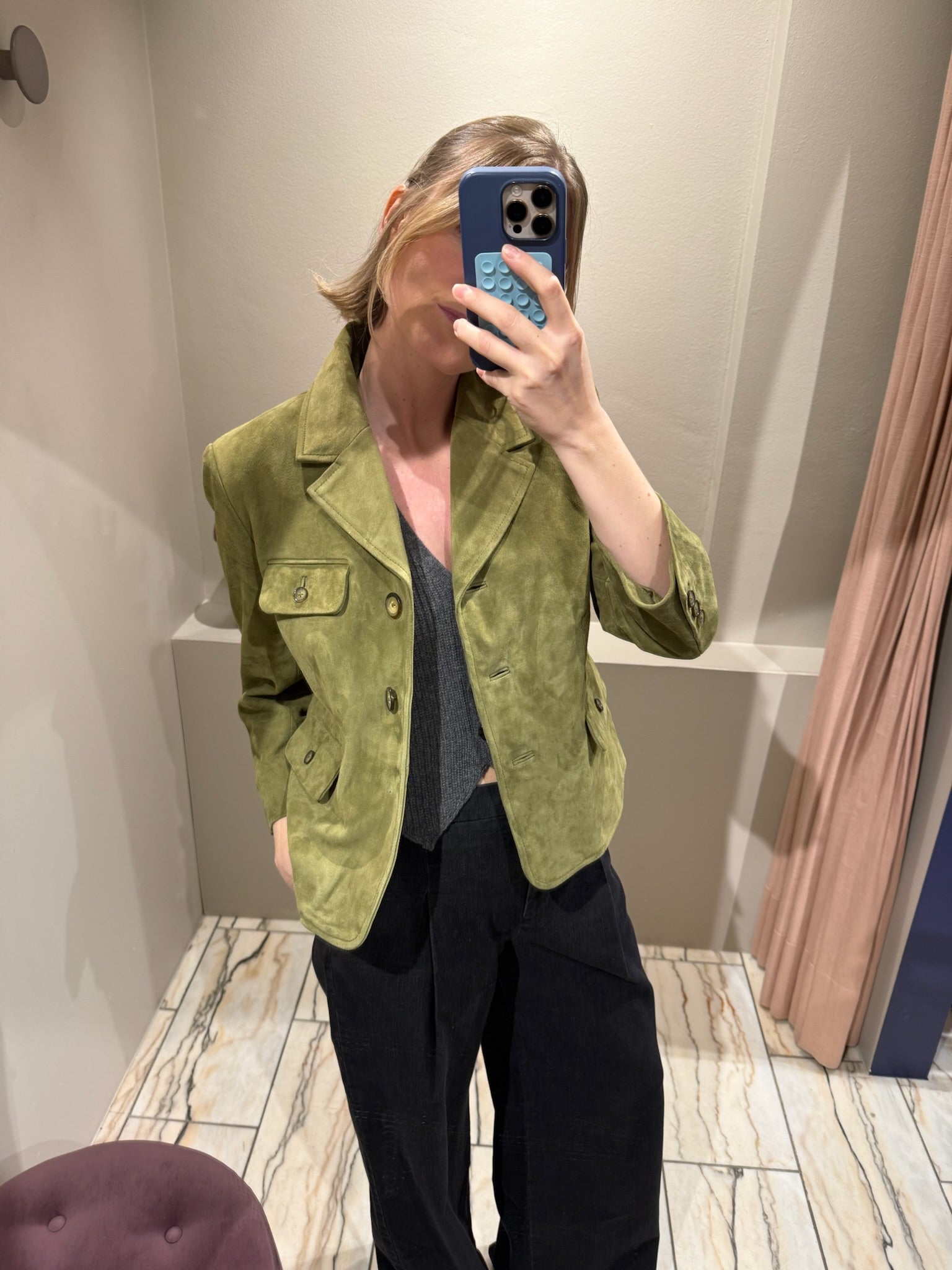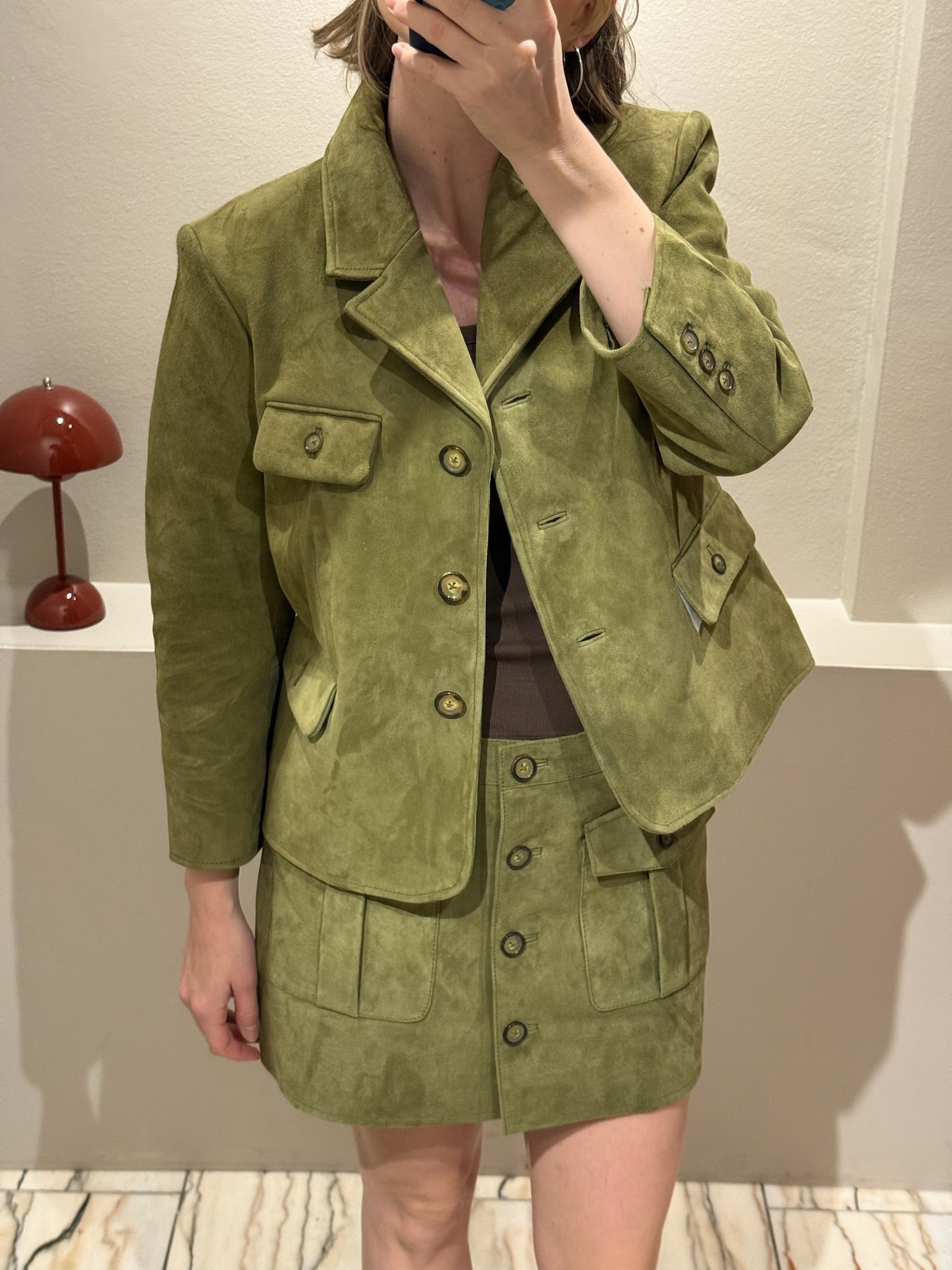 Die olivegrüne Wildlederjacke ist mit ihrer verkürzten, taillierten Silhouette eine femininere Variante des Oversize-Blazers. Die Jacke hat Fronttaschen und eine Knopfleiste.